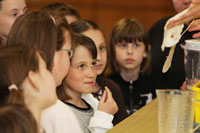 Az megnyitó beszédek után egy igyen szemléletes előadásban volt részük az érdeklődőknek, aminek során feldarabolt üdítőitalos dobozokból, amik egyaránt tartalmaznak fémet, papírt és műanyagot készítettek merített papírt egy egyszerű háztartásban is használatos turmixgép és víz segítségével.