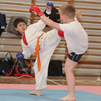 A következő kategóriában a szlovák, a Fő téri, Benka és a csabacsűdi Trefort általános iskolák ifjai mérhették össze tudásukat. Az első csoportban azok a gyerekek kerültek sorra, akik most vettek részt először igazi küzdelemben, ahol már valódi ütésekkel és rúgásokkal szerezhettek pontokat. Persze a szabályok itt is szigorúak, a legfontosabb a testi épség, a fejet még csak érinteni sem szabad, és minden versenyző komoly védőfelszerelésekkel van felvértezve. A nap a 10-11 évesekkel zárult, akik közül többen már nagyobb országos rendezvényeken is indultak, és ott is mérkőzéseket nyertek, néhányan érmet is szereztek.
