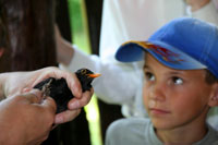 A séta után persze újabb ellenőrzés következett a hálónál, ahol egy fekete rigó hímet találtak, melyet zsákba bújtatva vittek át a gyűrűzési helyszínre. A gyerekek lelkesen követték vezetőjüket, hogy ellessék, hogyan kell szakszerűen gyűrűt helyezni egy madár bal lábára. A közben elhangzott kérdésekre helyesen válaszolók közül kiválasztott szerencsés engedhette útjára a rigót.