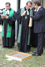Az alapkőletételen részt vett Ribár János esperes, Gáncs Péter püspök, Lázár Zsolt lelkész, Horváth Z. Olivér lelkész, Zátonyi János az újtemplomiak lelkésze, dr. Mekis Viktória, a Magyarországi Evangélikus Egyház igazgató-helyettese, Mihaleczné Kovács Mária, a Körös-szögi Kistérség Többcélú Társulás vezetője és Babák Mihály polgármester is. Az urnába elhelyezték az Ótemplomi Szeretetszolgálat dolgozóinak a névsorát, ami ennek a beruházásnak köszönhetően 9 fővel gyarapodni fog, az ótemplomi gyülekezet presbitériumának a névsorát, Evangélikus Életben, ill. a Békés Megyei Hírlapban a beruházásról megjelent híreket, valamint az intézmény alapító okiratát is. A fedlapot friss betonból készítették el a stólában öltözött egyháziak, ill. öltönyben levő polgármesterünk, aki meg is jegyezte, hogy nem olyan bonyolult dolog ez, ráadásul a gimiben egyébként is csak „kőművesnek” hívják. Jó volt nézni, hogy milyen összeszokottan simította a betont Lázár Zsolt és Babák Mihály. Szívesen látnánk a folytatást is!