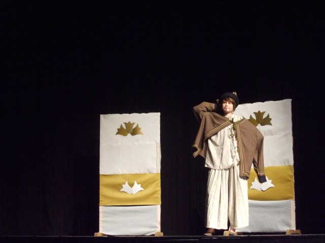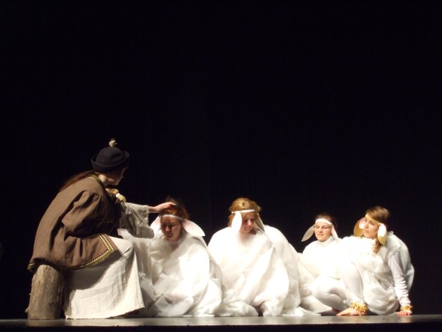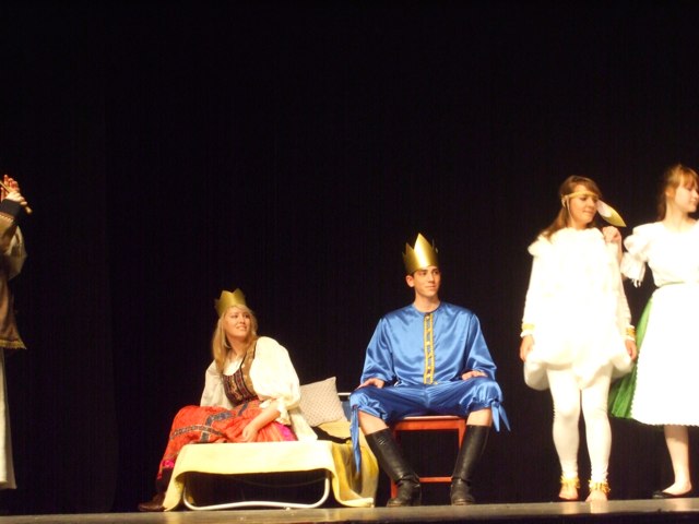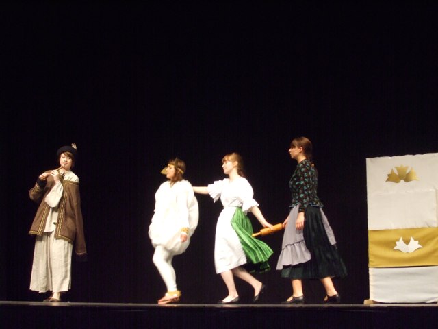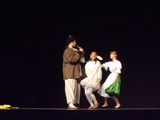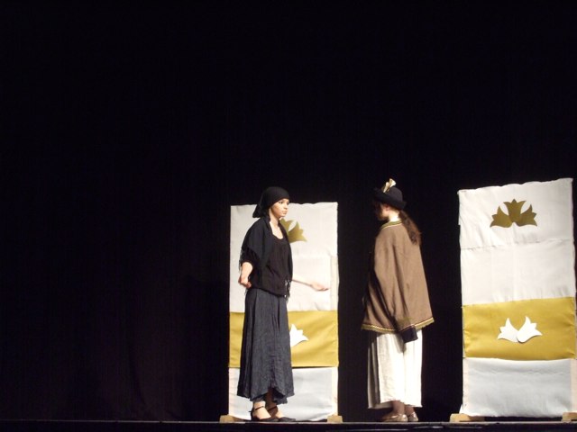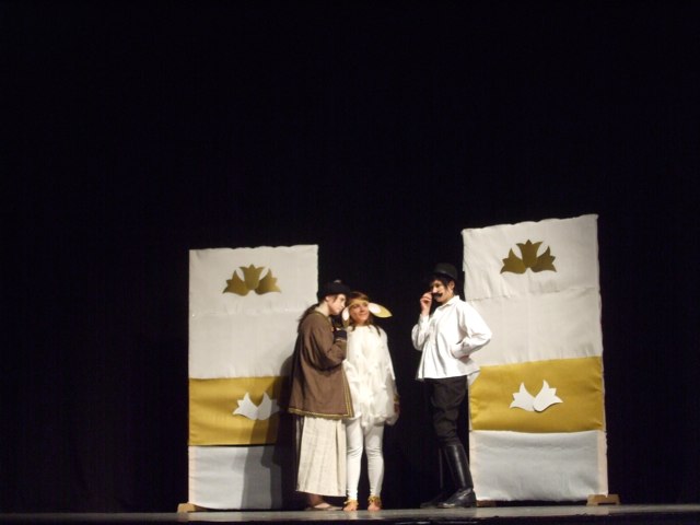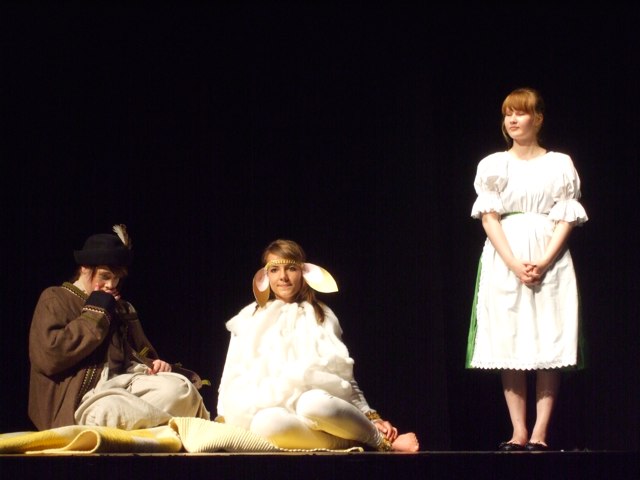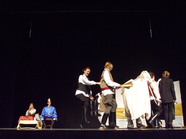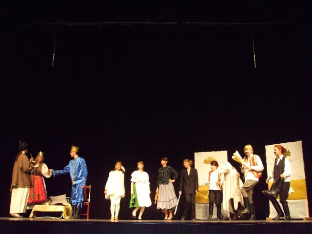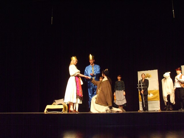 A felkészülés során mindenki kipróbálhatta kreativitását, kézügyességét, találékonyságát, tánctudását, énekhangját, hiszen a díszlet, a jelmezek, a zenei aláfestés mind-mind a mi közreműködésünk eredménye volt. A díszlet kialakításánál igyekeztünk felhasználni a megismert magyar népi motívumokat, a jelmezek jelentős részét pedig magyar népviselet alkotta. A zenei aláfestést természetesen magyar népdalok összeválogatásával oldottuk meg, az autentikus magyar népzenét pedig olykor élőzene – furulyaszó – is kiegészítette. A szereplők mellé választottunk még két narrátort is, akik a színpadi szereplők játékával párhuzamosan adták elő a történetet, melyet angol nyelvre fordítottunk le, így az előadás maga is angol nyelven hangzott el. Ennek köszönhetően nem csak mi, a projektben résztvevők, de iskolánk több osztálya és számos érdeklődő diákja, tanárja, próbálhatta ki nyelvtudását. Jól esett nekünk, hogy sok tanárunk is eljött, hogy megnézze a közös munkánk ’gyümölcsét’.