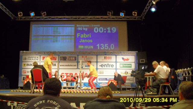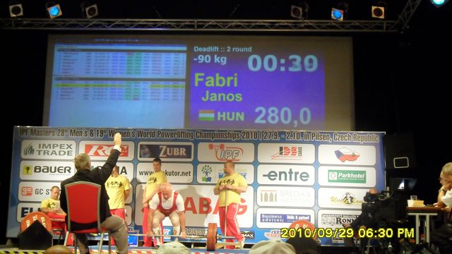 A csehországi Pilsenben a masters erőemelő világbajnokságon vállsérülése ellenére ismét parádésan szerepelt sokszoros bajnokunk Fábri János.A viadalon a 65 éves szarvasi sportmogul, aki a Gyulai Atlas-SE színeiben versenyez a masters 3 kategóriában (60 éven felüliek), 90 kg-os súlycsoportban indult, mivel testsúlya 44 dekával meghaladta a 82,5kg-ot, amely az ő eredeti súlycsoportja volt eddig. Így nem csak a bal vállának serülésével, hanem az eggyel magasabb súlycsoport elvileg erősebb versenyzőivel is meg kellett küzdenie. Janibá guggolásban 230 kg-ig jutott, amivel második lett, majd fekvenyomásban 130 kg-ot teljesített és ez a negyedik helyhez volt elég. Felhúzásban az örökifjú szarvasi sportoló 270 kg-os új Európa rekorddal kezdett, majd a 282,5 kg is sikerült, amivel ebben a számban aranyérmes lett és megjavította korábbi Európa-csúcsát. A verseny összetett győztese a 655 kg-ot teljesítő lengyel Sochanski Stefan lett.