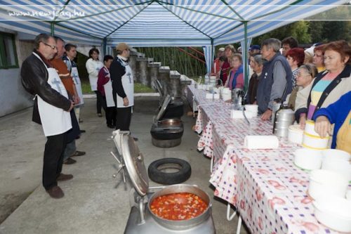 Rövid hálaadás után ismét ételt osztottak az Önkormányzati üdülő udvarán a hétvégén. Jeles nap volt ez, mert Illyés Gábor kiosztotta ötvenezredik adag meleg ételét, ami egyben a Szarvason kiosztott tízezredik volt. A szombati menü felesborsó leves, babgulyás, lucskos káposzta, ill. körömpörkölt katonásan volt. Ezúttal az Evangélikus egyház és Lázár Zsolt, valamint Besenczy Zoltán állta a költségeit.