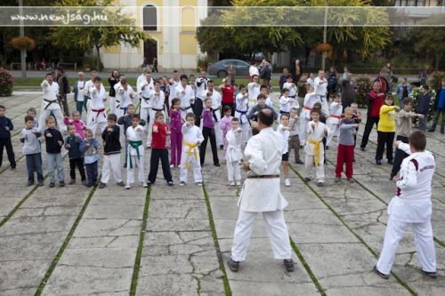 Az edzés anyaga az egyenes rúgás – mae-geri – és annak védése volt. Kicsik és nagyok harci kiáltásokkal töltötték meg Szarvas főterét.
