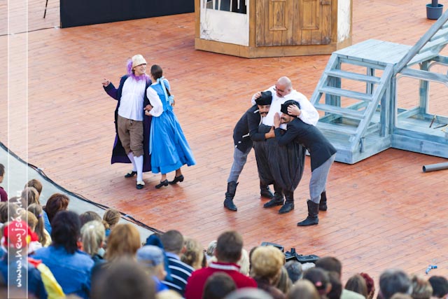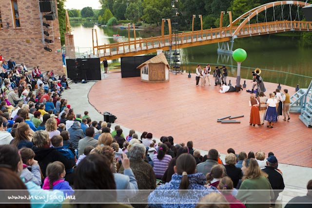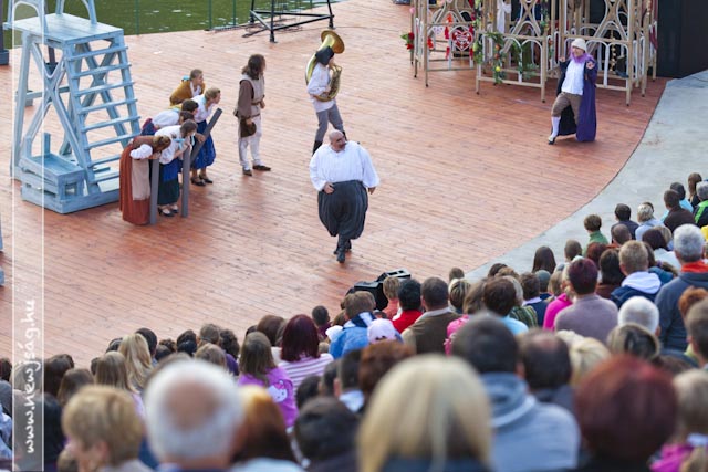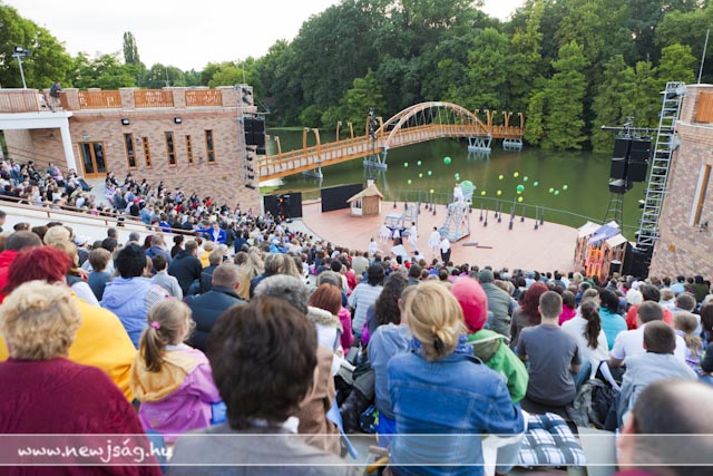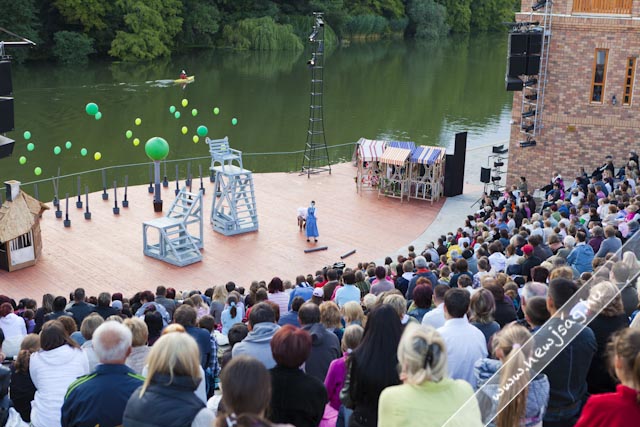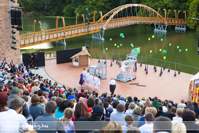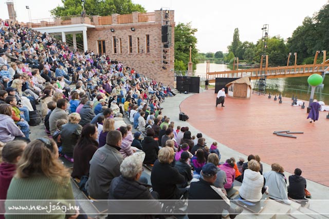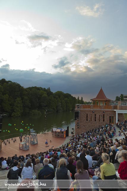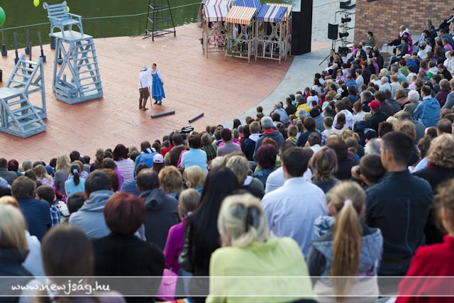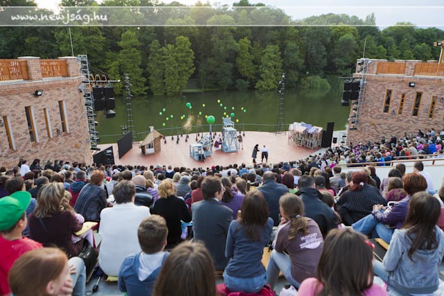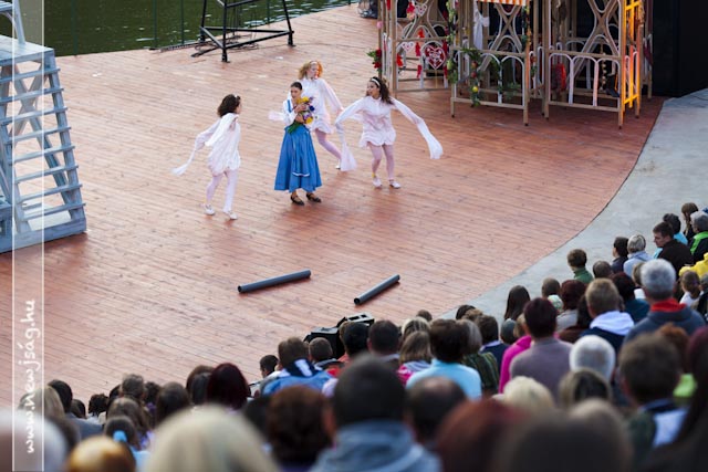 A Jókai Színház minimáldizájnú díszlettel érkezett az előadásra, aminek az erdő hátterét a mögötte levő liget adta. Fölösleges is lett volna bármilyen díszlettel eltakarni a hátteret, az Erzsébet ligetet, a Körös vagy az új Fahidat, mert erre van kihegyezve az egész Víziszínpad, hogy egy ilyen csodálatos természetes, és a természettel összhangban levő épített környezetben, a friss levegőn élvezhessék a nyári előadásokat a színház- és zenebarátok.