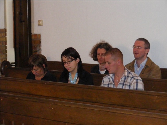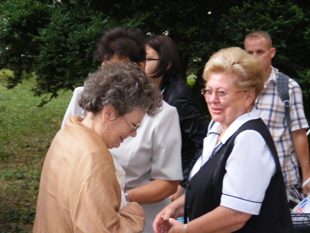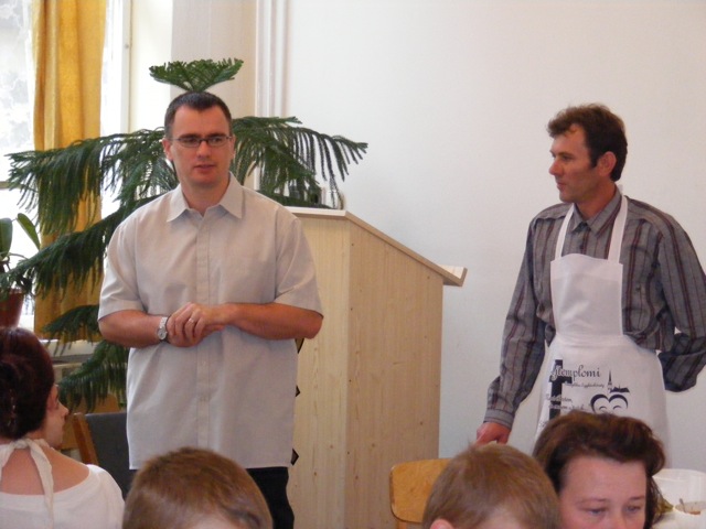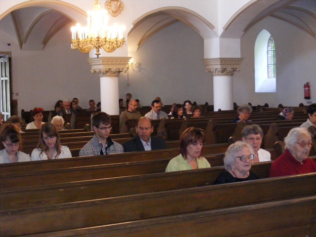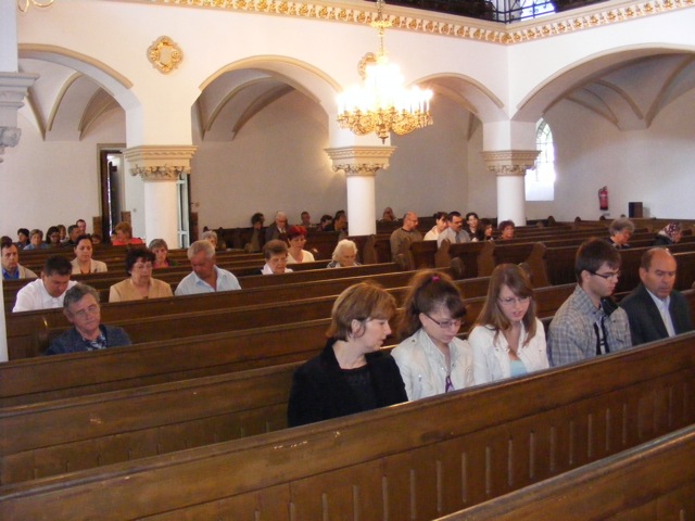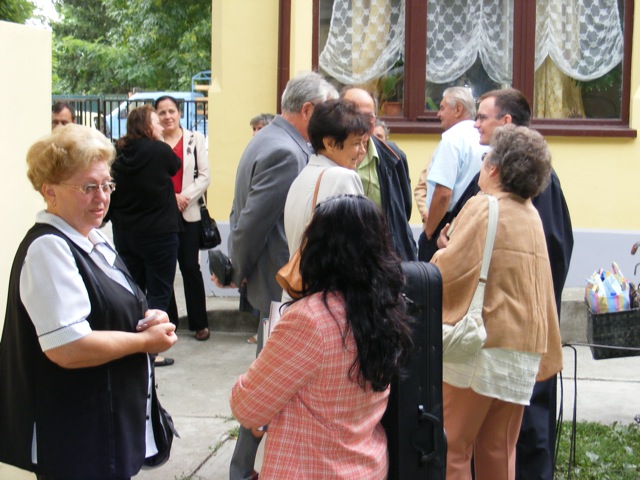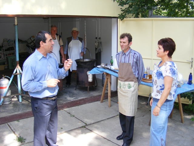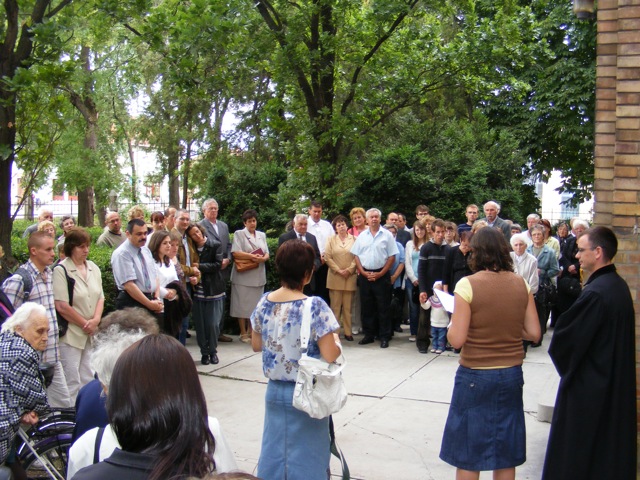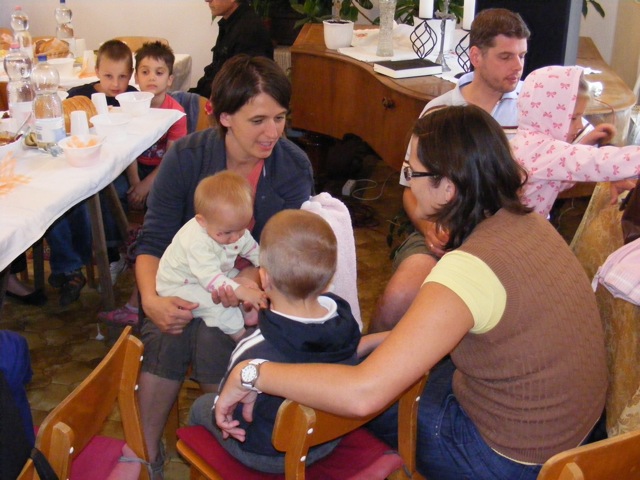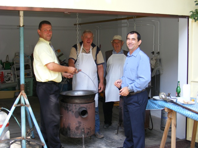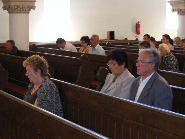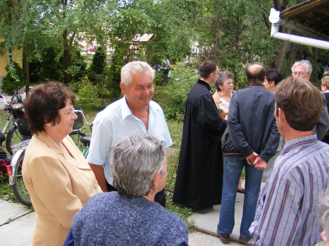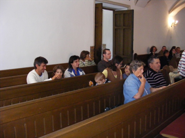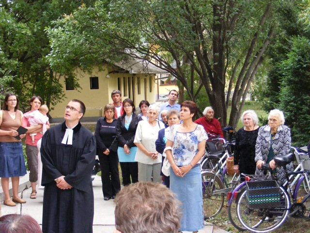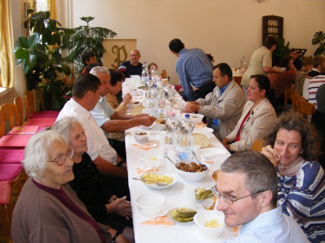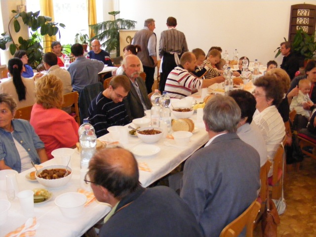 Ezek után 70-80-an álltuk körül a két bográcsot, hiszen a birkapörkölt illata már mindenkiben, aki csak a templomudvaron volt, felébresztette az ebéd utána vágyat. A várakozás alatt kicsik és nagyok vidám, családias hangulatban beszélgettünk egymással. Még egy Amerikából hazalátogató család is velünk ebédelt és idézte fel kedves emlékeit. Mindenki örömmel segített, sokan-sokféle finomságot hoztunk, kifejezve ezzel, hogy az elmúlt egy év alatt kincsekké váltunk egymás számára. Amikor az ember tekintetét felemelve rámosolyoghat valakire, egyszeriben úgy érzi otthon van. És mi, az újtemplomi gyülekezet tagjai ezt érezzük, itthon vagyunk. Valóban egy kézzelfogható család vagyunk. Mert ennek az alkalomnak a sikeréért mindannyian tettünk valamit. Ahogyan egy családban, mindenki tudta, érezte, mi a feladata. Ez az Isten kegyelme, hogy közösséggé formál bennünket folyamatosan. „Mert mindannyian gyémántok vagyunk Isten kaleidoszkópjában.” (Adrienn Plass)