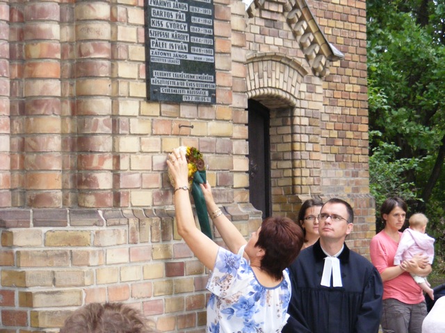 Az istentisztelet végén került sor a templomunk falán lévő emléktábla megkoszorúzására, melyen a Szarvas-Újtemplomi Evangélikus Egyházközségben szolgált, elhunyt lelkészek neve olvasható. Az ő munkájuk, szolgálatuk eredménye is, hogy ezen a napon egy élő gyülekezet tagjai lehetünk.