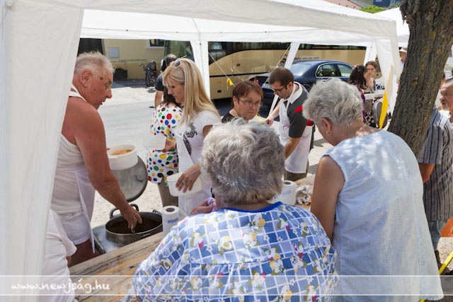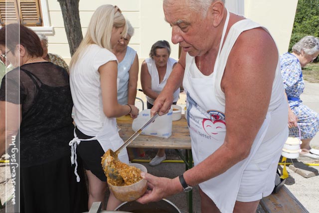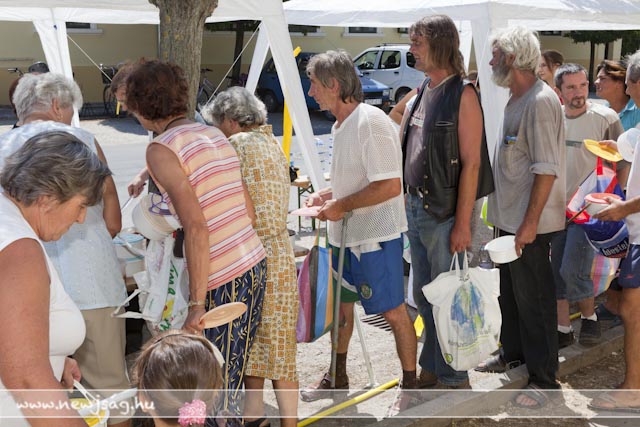 Az Evangélikus Ótemplom melletti parkolóban ezúttal Gombár Györgyné, az Íráskép Gyorsnyomda és a Fábri Konditerem jóvoltából gyújtottak be a gulyáságyúba. Ahogy azt Lázár Zsolt evangélikus lelkész a korábbi ételosztásokkor elmondta, nem csak télen van szükség ilyen akcióra, nem csak akkor nem jut minden nap meleg étel az asztalra. Ezúttal egyáltalán nem kellett attól tartani, hogy elhűl az ebéd, amíg az asztalra kerül, mert kellemes nyári nap gondoskodott az étel melegen tartásáról.