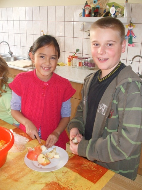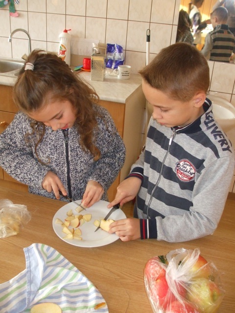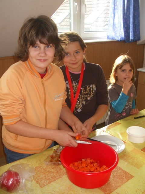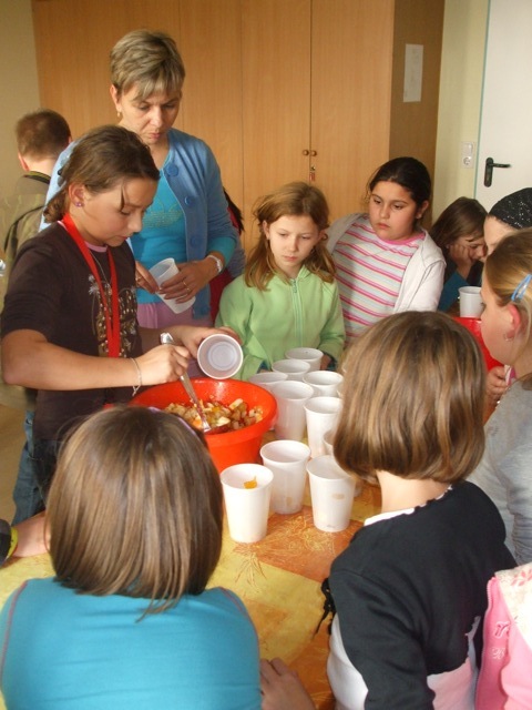 Az egészség megőrzésének egyik leghatékonyabb módja a helyes táplálkozás kialakítása. Otthon, a gyerekek által is könnyen elkészíthető zöldség-és gyümölcssaláta összeállítására invitáltuk meg őket. Az étel egyszerűségét mi sem bizonyítja jobban, mint hogy tanulóink teljesen önállóan pucoltak, szeleteltek, vágtak és aprítottak. A végeredmény is önmagáért beszélt: az osztályokba juttatott kóstolók pillanatok alatt elfogytak.