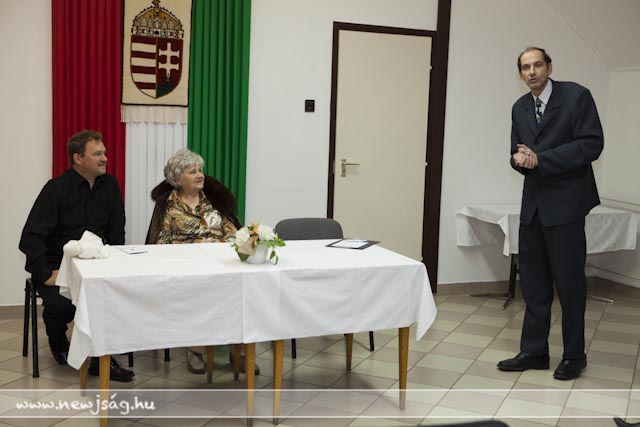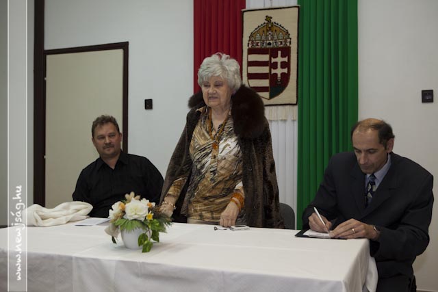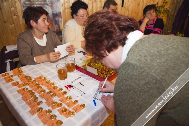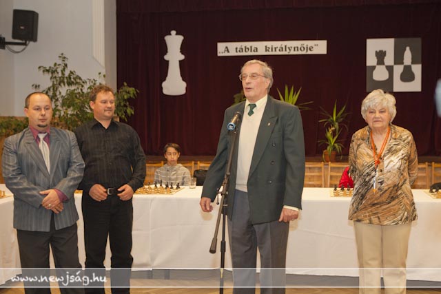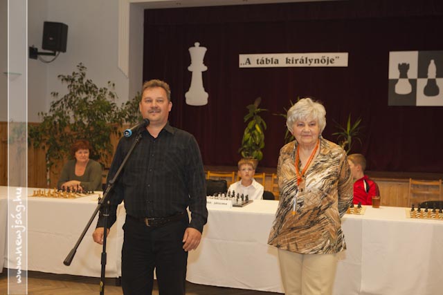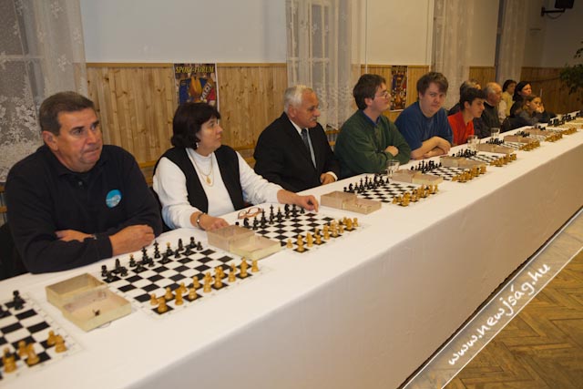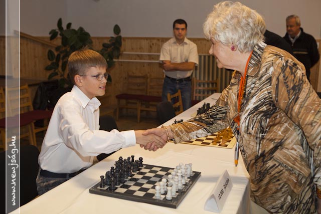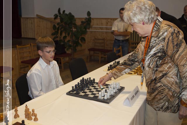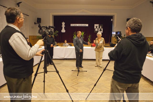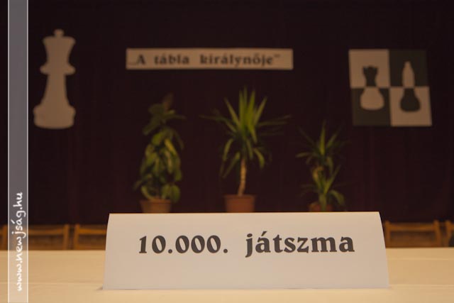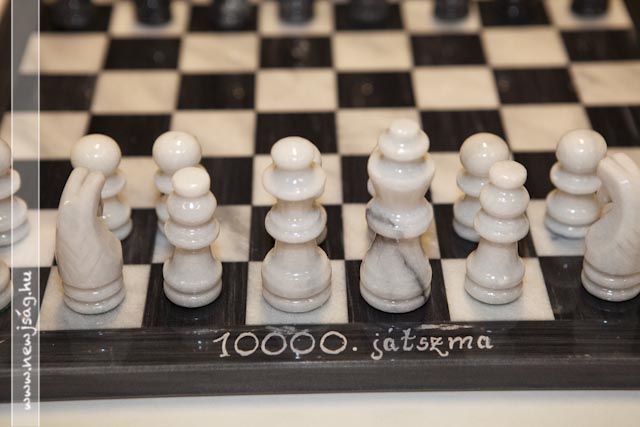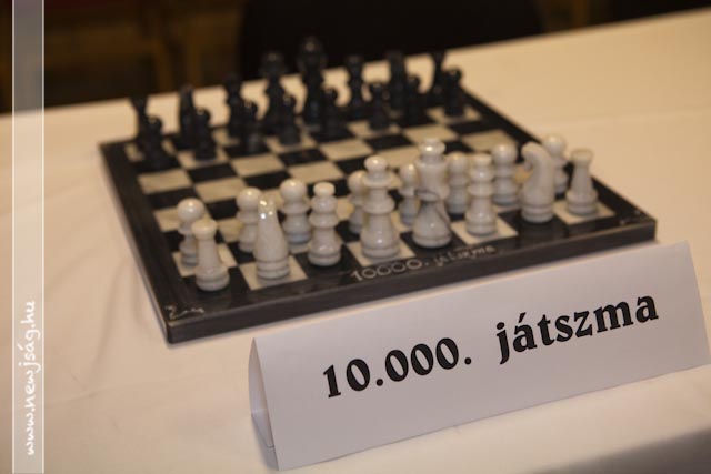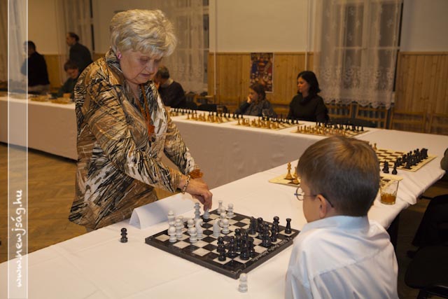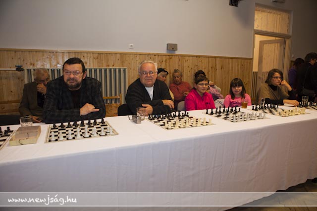 111125sakkHogy jut el valaki a 10000. sakkjátszmáig? Megtudhattuk pénteken délután, amikor Sinka Brigitta sakkmester 10000. sakkszimultánjára készült. Az egyik legfontosabb, hogy jó hosszú életet éljen. Az eseményre 83 évesen 9955 játszmával a tarsolyában érkezett a szentandrási sakkmester. Ez már magában is világrekord, de hitelesített kategóriában mindenképpen. Ahogy azt Brigitta néni elmondta, a MÉH-nél dolgozott, mikor a cég vezetésének megbízásából elkezdett sakkszimultánokat játszani. A szimultán a sakk önmagát népszerűsítő változata, mikor egy mester egyszerre több táblán küzd ellenfeleivel. Míg napközben a cégénél a hulladékgyűjtés volt a cél, addig a sakkszövetség a fiatal sakktehetségek felkutatásával bízta meg. Egy idő után a MÉH vezetése is támogatta sakkmissziójában, aminek során 330 iskolába jutott el, természetesen a sakk mellett a hulladékgyűjtést is népszerűsítve. Már az elejétől kezdve hiteles formában füzetben regisztrálta a mérkőzéseket. Öt teleírt füzeten keresztül át vezetett az út idáig, a szentandrási Körös Művelődési Házig, ahol 45 táblán kellett lejátszania. Laza csuklómozdulatok sora ez neki, hiszen 103 táblás  szimultánt is játszott már pályafutása során. A 10000 játszmának egy fekete és fehér márványból készült táblával és figurákkal adták meg a módját, amit az egyik unokaöccsével játszott le.