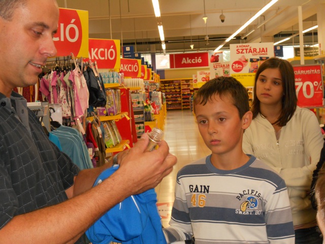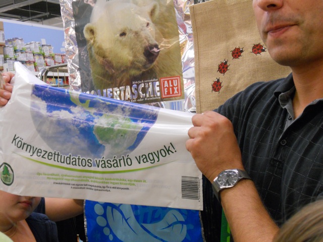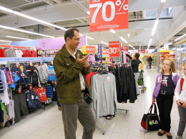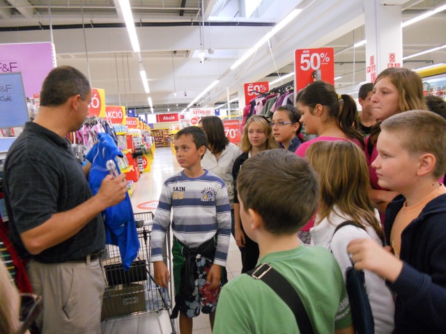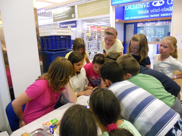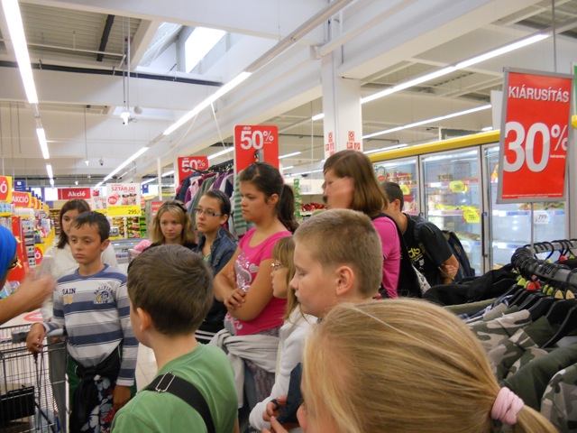 Ezután a vásárlótérben folytattuk a tanórát. A különböző műanyag-csomagolásokkal és a jelzésekkel ismerkedtünk. Megtudtuk mennyi mindent gyártanak Kínában műanyagból és milyen sok energiát és pénzt takarítunk meg, ha kosárral vagy textiltáskával megyünk vásárolni.