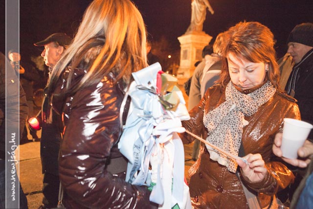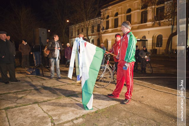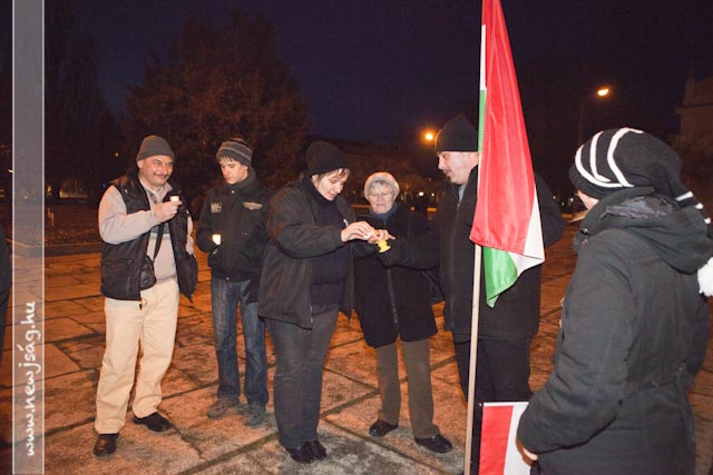 Időközben megérkezett a zászló is, amire a téren várakozók szalagokat kötöttek. A trikolor felé felkerültek gyomaendrődi, a szentandrási és helyi civil szervezetek kis kék szalagjai is. A Himnusz közös eléneklése után “Hajrá Magyarország!” felkiáltással Babák Mihály polgármester törte meg a csendet. A demonstráció békésen, minden rendzavarás nélkül, beszélgetésbe hajló teázgatással fejeződött be.