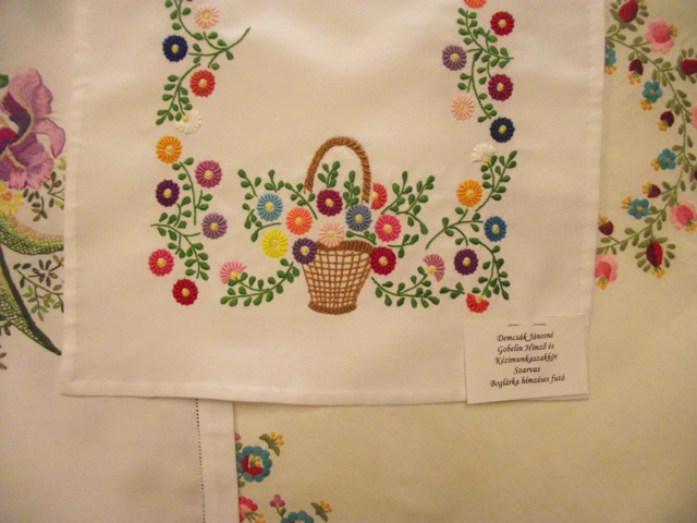 A kiírt pályázat szerint főleg népi hímzésekkel lehetett pályázni, de elfogadtak néhány modern keresztszemes munkát is. Ennek megfelelően vittünk terítőket, futókat, párnákat, illetve elvittük a népviseletes babáinkat, melyek, mint a kiállítás egyik érdekességei és különlegességei szerepeltek.