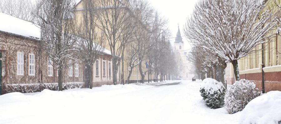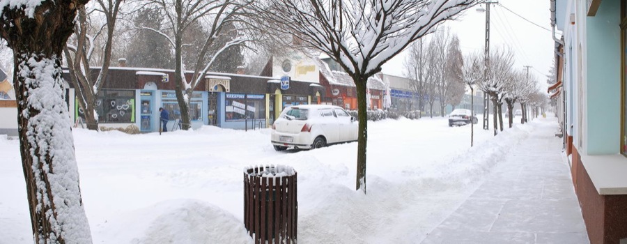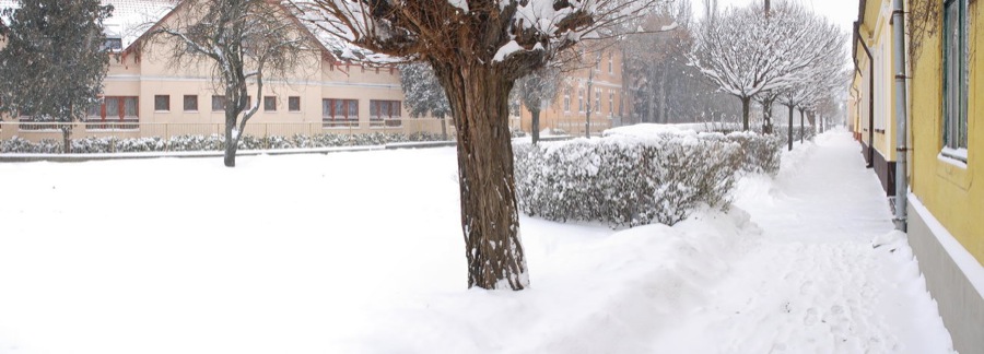 120204panoramaRégen látott havat és kemény mínuszokat hozott ez a hétvége, ami az egész város számára biztosít sportolási lehetőséget, hólapátolás sportágban. Reggelre 14 centi hó hullott, de azóta valószínűleg elérte a 20-at is. Ember nem jár az utcákon, aki teheti, az ablak mögül nézi a szakadatlan hóesést, ami most még gyönyörködtet, de egy hét múlva tele lesz vele a hócipőnk.