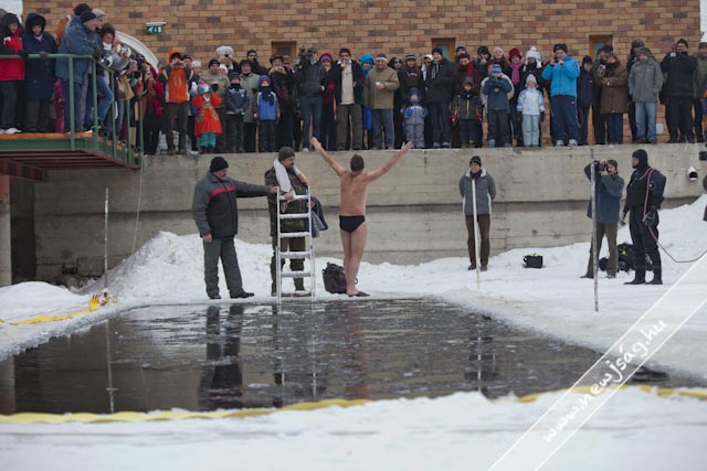 Mire Schirilla György megérkezett, már megtelt a part érdeklődőkkel. Egy kis, polgármesterünkkel, Babák Mihállyal történt verbális bemelegítés után a sportoló futott egy keveset, majd levetkőzött, és mindenki szörnyülködése mellett belemászott a jégkásás vízbe. Néhány hossz megtétele után kiült a jég szélére, csinált pár lebegőülést, pózolt még egy kicsit, majd visszament jól megszokott közegébe. Ezt vagy háromszor megismételte a hazai és vendég média nagy örömére, így aki mégsem hagyta ott a karosszékét sem maradt le semmiről.