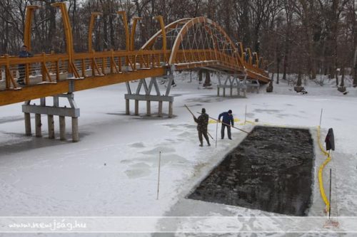 Az úszásnak egy kis technikai akadálya is volt, mert a több mint egy hete tartó kemény tél eredményeképp az bizony be van fagyva. Ez azért komoly akadálya lett volna a produkciónak, de a nap másik hőse, Kondacs György jóvoltából ez is elhárult egy 5×10 méteres, hatalmas lék formájában, amit még tegnap vágott. Reggel majdnem kezdhette az egészet elölről, mert az éjszaka folyamán a felszíne befagyott és ismét 5 centis jég várta.