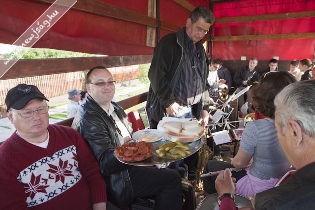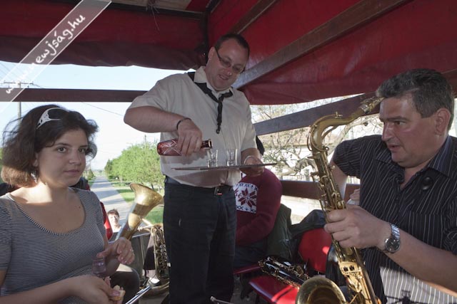 A zenekar nagyon tapintatos. A külterületen kezdik, ahol felvesznek még két fehérnépet, akik szintén közéjük tartoznak. Már itt süteményekkel, kolbásszal és pálinkával kínálták a társulatot. És így ment ez az egész ébresztő folyamán. A zenekart otthon az ágyukból észlelők nem is gondolnák, hogy Szarvas szerte milyen szeretettel fogadják. Van, ahol pillanatok alatt előkerül a korábban odakészített szervízasztal tele finomságokkal, többnyire szárazkolbásszal, uborkával, a házigazda büszkesége típusú pálinkával és házisütésű finomságokkal. A zenekar megbecsülését a feléjük áradó szeretet mellett egzakt módon le lehet mérni a kínált pálinka minőségéből. Ezt szúrópróbaszerűen ellenőrizte, jelen sorok írója, aki megállapította, hogy a szeretet foka túláradó.
