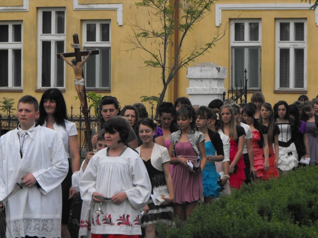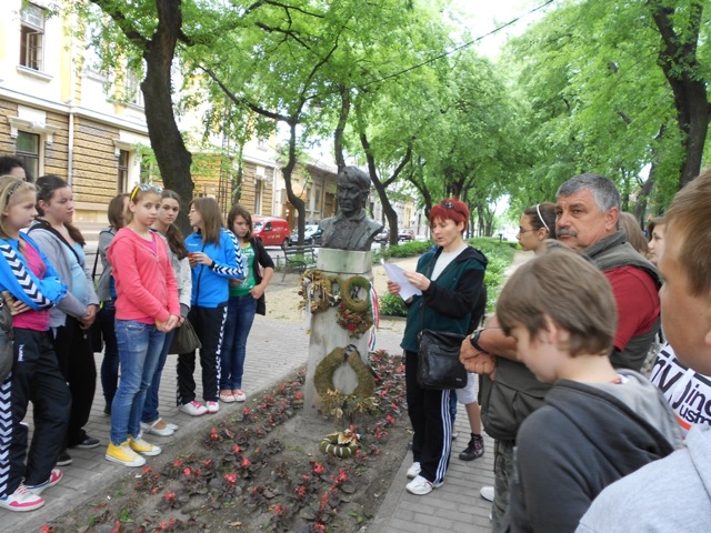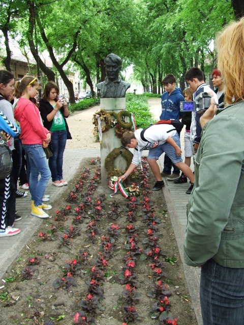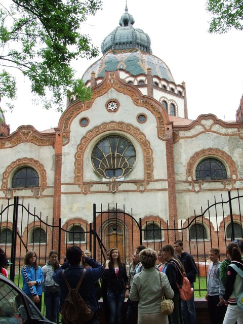 Útközben megálltunk Szabadkán, itt a város nevezetességeivel ismerkedtünk: Barátok temploma, Fő tér, Zsinagóga. Megkoszorúztuk Kosztolányi Dezső mellszobrát, a költő Európa című versét Jani Erzsébet olvasta fel. A városháza szecessziós stílusú épületében megpihenhettünk a Tanácsteremben, melynek üvegablakairól a magyar történelem nagyjai tekintettek ránk. Megérte a hosszú lépcsőzés, a toronyból csodálatos kilátás nyílt a városra. A szabadkai végzős diákok bolondballagása közepette hagytuk el a várost.