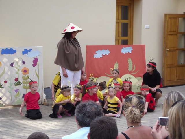 A hétfő a miniké volt, a Katica csoport két pártra szakadt, a büszke katicák, és a hetyke méhecskék bizonygatták egymásnak, hogy ki az ügyesebb, verseket, mondókákat, énekeket adtak elő, sőt még szlovákul is „zümmögtek”. Természetesen az imádkozás sem maradt el. A műsor csúcspontja a látványos kibékülés volt, az esőben bajba került rovarok a gomba védelmet nyújtó kalapja alatt rájöttek, hogy békességben élni sokkal jobb, mint a csúfolódás.
