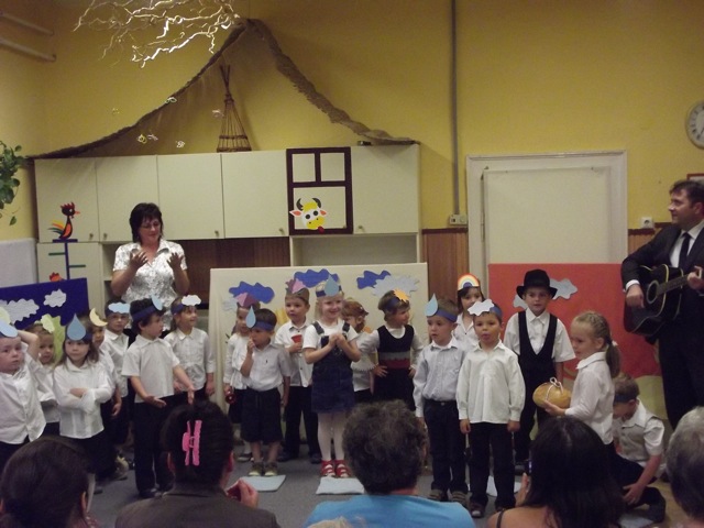 A középsősök Fésűs Éva: Bundavásár c. meséjét játszották el nekünk. A történetet átszőtte az év közben tanult dalok, és mondókák sokasága, miközben a mesét követtük, közben észrevétlenül számot adtak gyermekeink a játékosan megtanult ismeretanyagból.