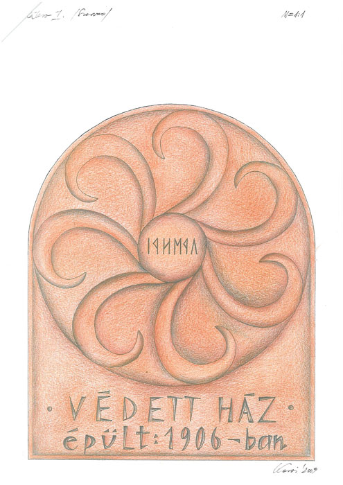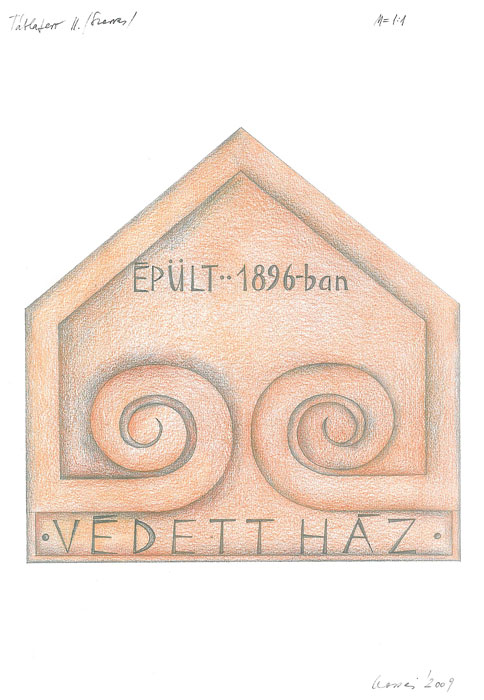 A tábla alakja négyzetből kirakott, tympanon alakú házoromzati forma. A tábla szimmetrikus tengelyű, belső része csiga vonalban végződő. A motívum a folytonosság, az örök élet és halhatatlanság szimbóluma. Ez az egyszerű formaelem az antikvitás, eklektika jellemző jelölési módja is. Folyton változó világunkban az állandó,- védendő- érték emblematikus kifejezésére, jelölésére alkalmas motívum.