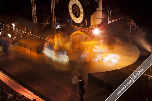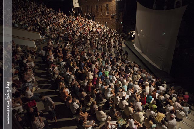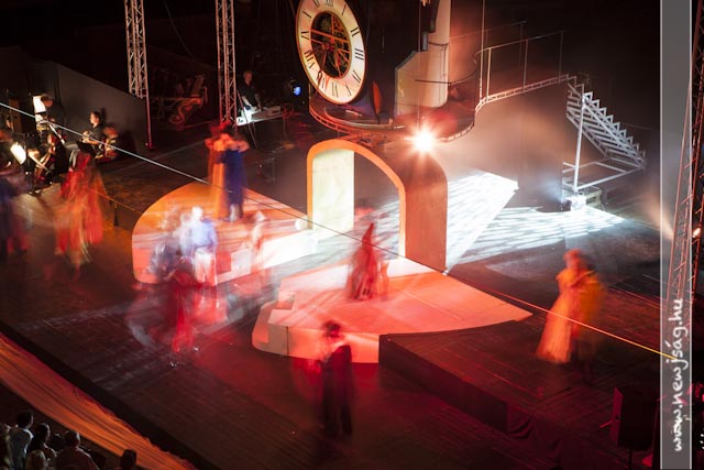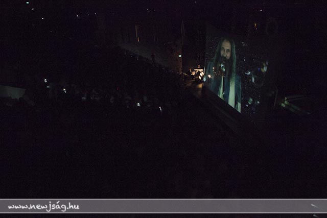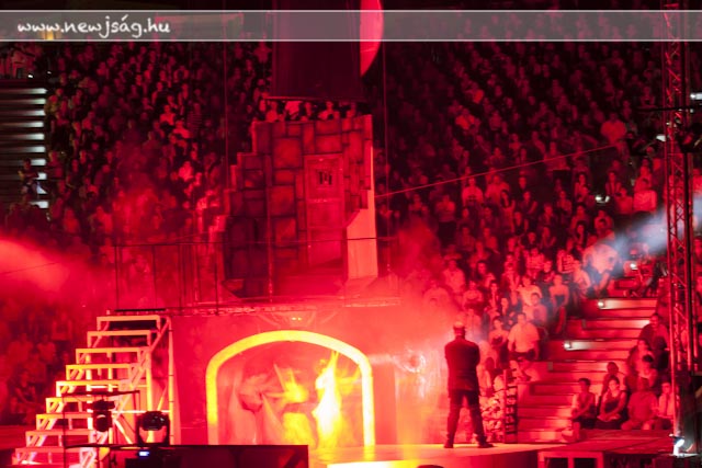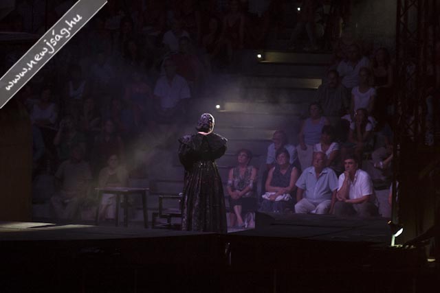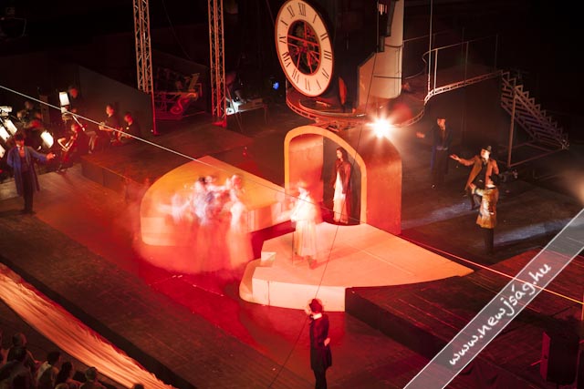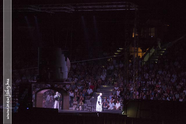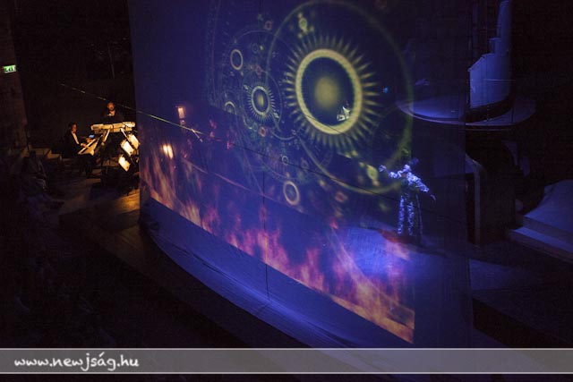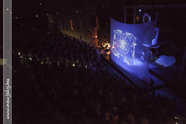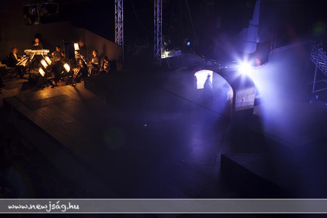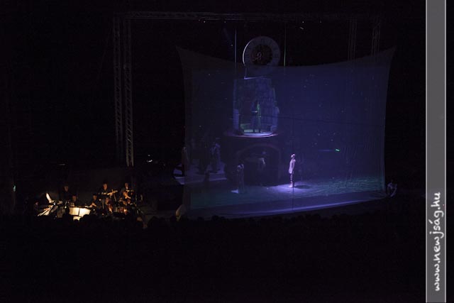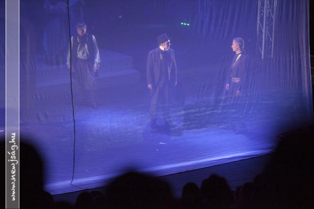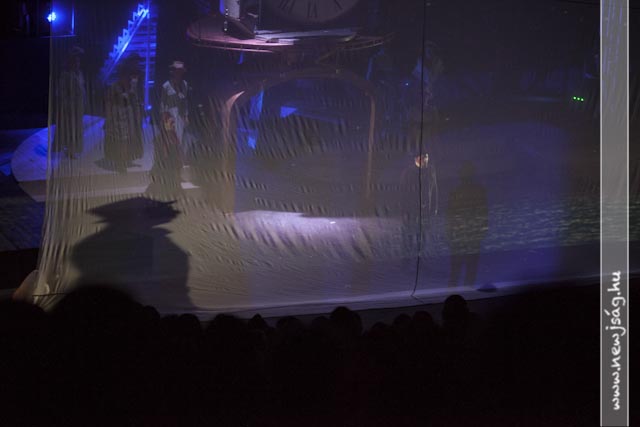 Látványelemben pedig nagyon gazdag volt az előadás. Nagyot mutatott az a sejtelmesen átlátszó hatalmas vászon, amit a színpad elé feszítettek és vetítéssel tettek élővé, de mögötte látszottak a történések, és amit rémprofin kezeltek húztak fel, vagy engedtek le a kámzsás munkatársak.