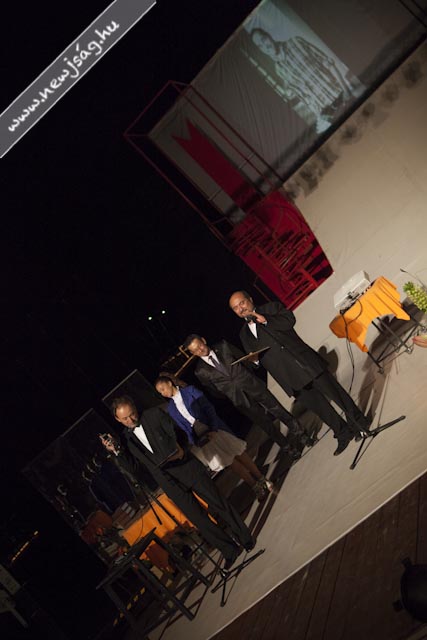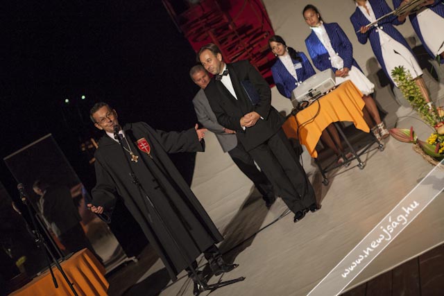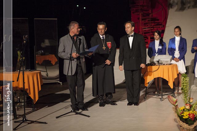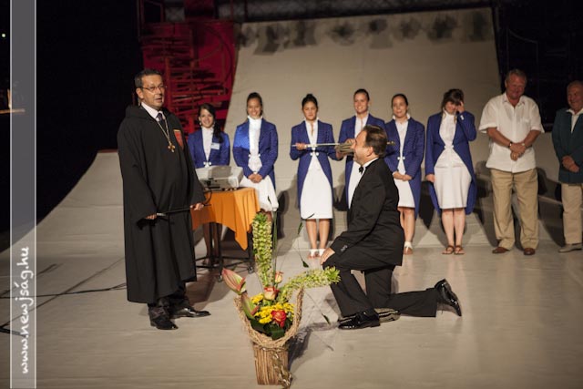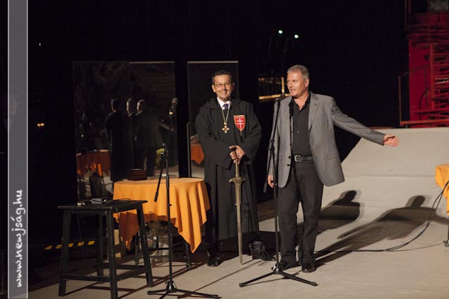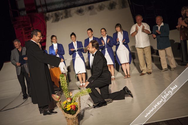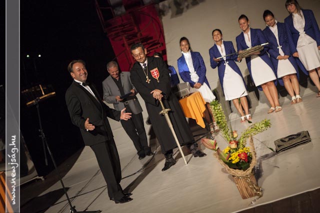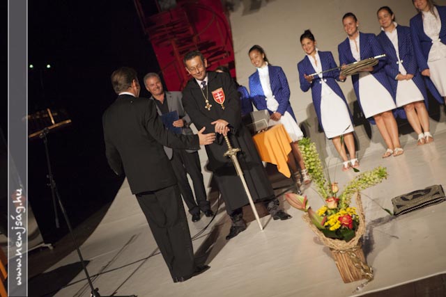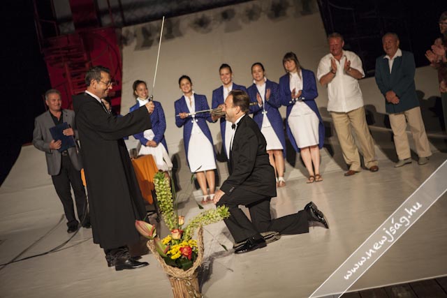 A díjátadók után polgármesterünk teljes harci díszben karddal a kezében (ami egy éve még nem volt) a színpadra rendelte a képviselőtestület tagjait és jelenlétükben a Vízi Színház lovagjává avatta Fekete Pétert.