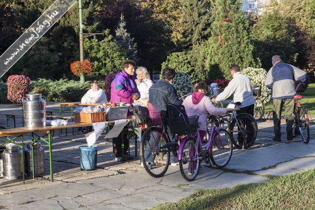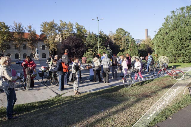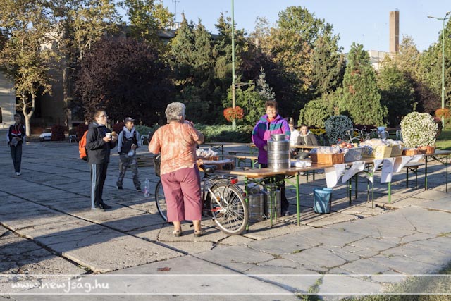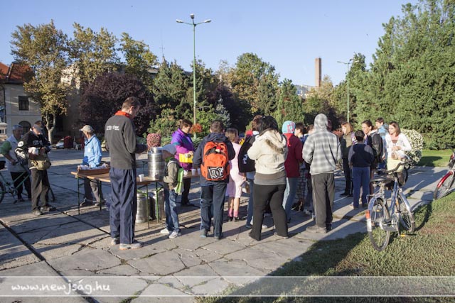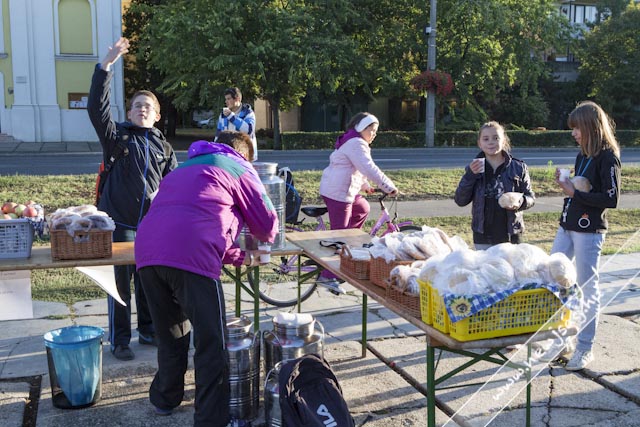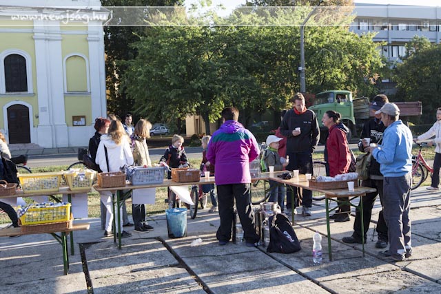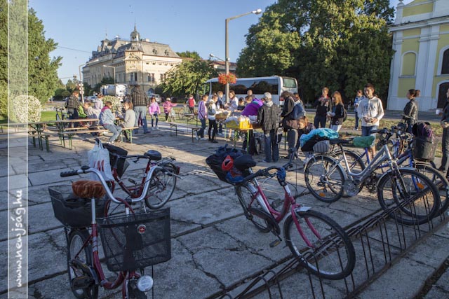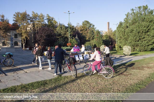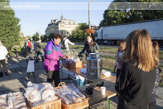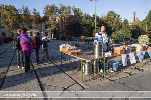 120921reggeliAz Európai Mobilitási Hét keretében ma reggelizni hívták a szervezők a kerékpárral munkába járókat a Fő téren felállított kínálóasztaloknál. Sokakat annyira meglepett a dolog, hogy inkább megijedtek az ingyen reggelitől, mintsem megálltak volna öt percre, és ittak volna legalább egy birodalmi teát a 10 fokban, olyat amilyet a napköziben adtak még hajdanán, és aminek az ízmintája mind a mai napig le van tárolva az ember ízlelőbimbóinak a memóriájában. Persze nem csak teát lehetett inni, hanem kakaós csigát és szendvicset is reggelizni. Elég nehezen indult a fogyasztás, már-már úgy nézett ki, hogy Tobak László, a hét főszervezője az idén csak kakaós csigát és szendvicset fog enni, mikor a tömeg elkezdte generálni önmagát és egyre többen álltak meg az asztalnál egy villámreggelire.