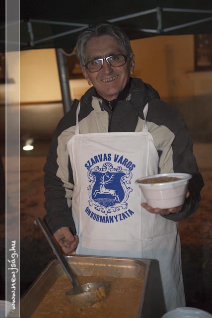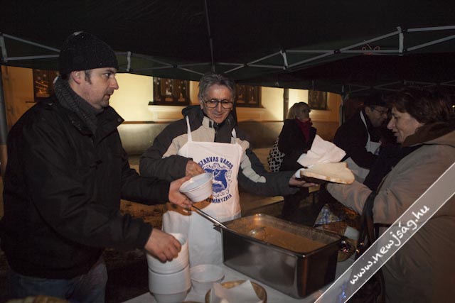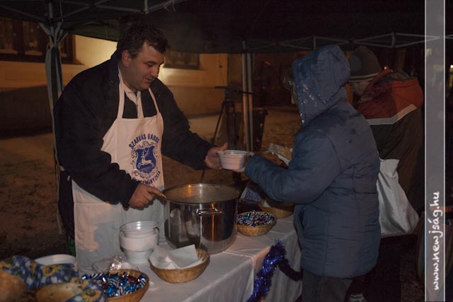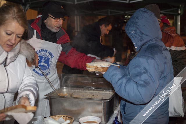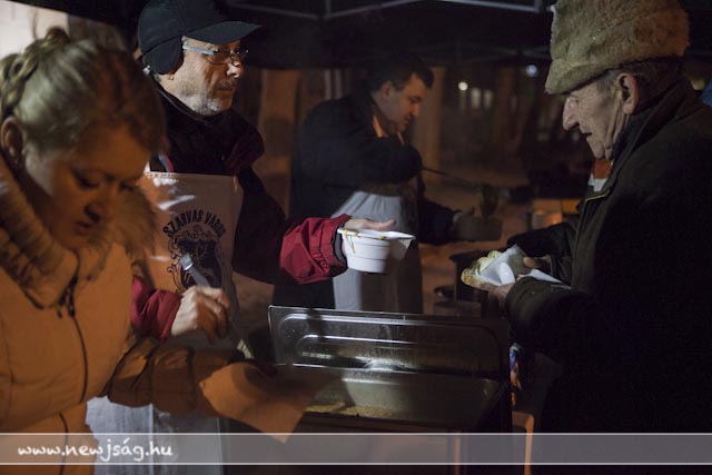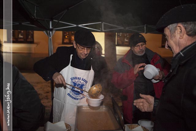 A gyertyagyújtás után az Önkormányzat dolgozói és a képviselők meleg étellel várták a rászorulókat, miközben még minidig sűrű pelyhekben hullott a hó.