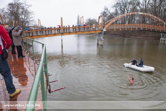 Ezen a télen nem volt olyan jég, mint tavaly, ami látványos színházi díszlet biztosított volna az eseményhez. Ehelyett plusz 8 fok, változó erősséggel szemerkélő eső és talán a tavalyinál kevesebb érdeklődő várta a sportembert. Na meg a kb. 1,6 cm hideg víz! Nem is ismételte meg az amúgy is valószínűleg udvariasságnak szánt kérdését, hogy vele fürdőzik-e valaki. Senki sem akart vele tartani a jóban. Érthetetlen. Na, majd jövőre!