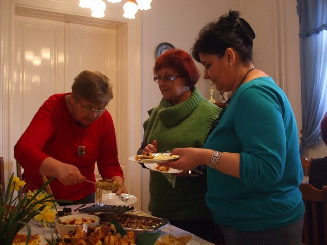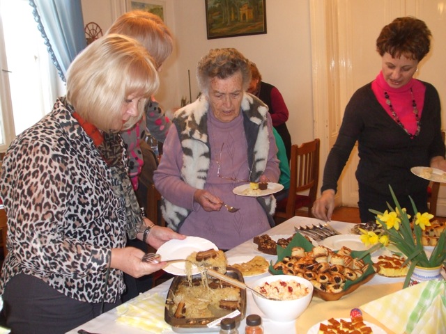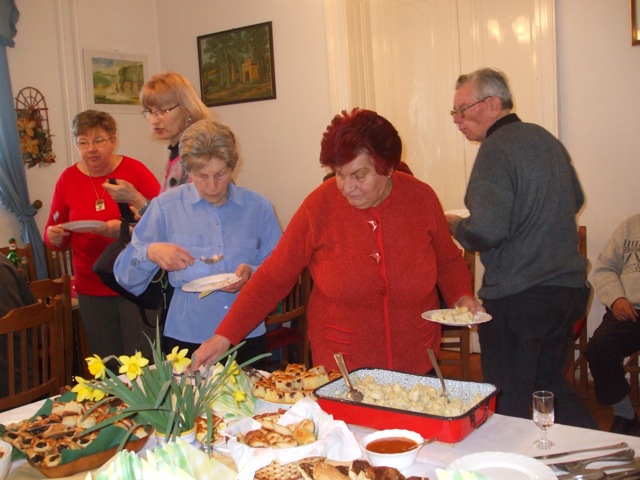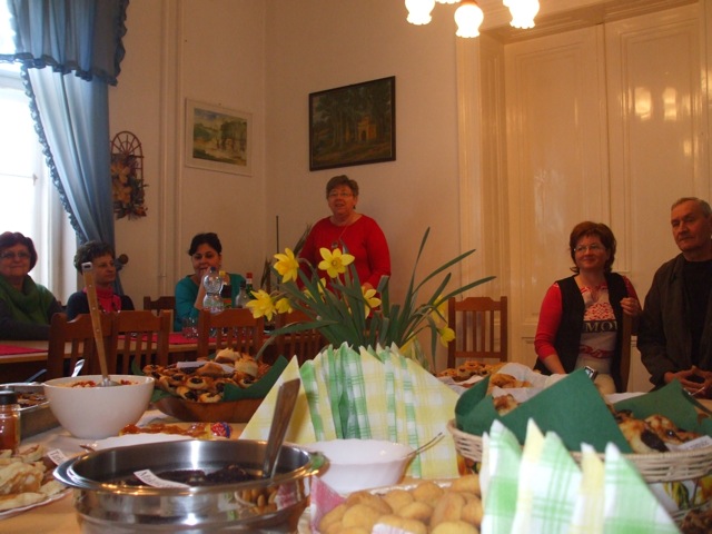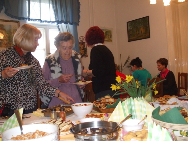 Ismerős illatok csalogatták be a Szarvasi Szlovákok Kulturális Körének tagjait hétfőn délután az Eötvös utcai közösségi házba. Hagyományos szlovák ételek bemutatójára gyűltek össze a főzést és kóstolgatást kedvelők, akik a tótasztal kínálatát 17-féle tradicionális étellel gazdagították. Frankó Anna a Vernosť elnöke örömmel nyugtázta azt, hogy nagyszámú érdeklődő jelent meg az évente megrendezésre kerülő programon és a válság ellenére is a tagok ínycsiklandóbbnál-ínycsiklandóbb népi étkeket varázsoltak az asztalra. A szarvasi tót étkek jelképezik a városban és környékén élők közös múltját, az egyedi variánsok pedig az elkészítők ízlésvilágát, fantáziáját. A hagyományok őrzéséhez, felelevenítéséhez e szép tavaszi, napsütéses délutánon škorce készítésével járult hozzá Gombkötőné Jutka néni, görhe kreálással Vargáné Marika, lekváros papucs és pogácsa sütéssel Rágyanszkiné Marika, brindzás nokedli főzéssel Bencsíkné Marika, tarkedli sütéssel Frankó Anna, meggyes pite készítésével Kudlákné Marika néni, mákos és brindzás gubát alkotottak Bohnyát Zsuzsa néni és Krizsánszkiné Erzsike néni, libazsíros loksát és lekváros gőzgombócot tálalt Alena Červeňanská, sült túróval színesítette a választékot Eva Labišáková, kruťovníkot sütött Zlatka Líšková, tojásos nokedlit szaggatott Kmotricza Margit, lekvárníkát kavart Szklenárné Tóth Éva és szalonnás tepsis káposztát hozott Kissné Szeljak Gabriella.