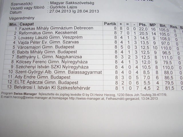 Április 26-28 között Szombathelyen rendezték meg az Országos Sakkcsapat Döntőt. A középiskolásoknál 13 csapat indult. A szarvasiak a 8. helyen voltak rangsorolva az élő pontok alapján. A vasárnapi hajrában a 9 partiból 7,5 pontot hozva a negyedik helyet szerezték meg. A nagy álom / 3. hely/ nem sikerült, de Patkó Lajos büszke a “lányaira” és eredményhirdetéskor együtt örültek a helyezésnek. A szoros eredményre jellemző, hogy a harmadik helyezett csak egy ponttal volt előttük, míg a 5-7. helyezett csapat szintén csak egy-egy ponttal mögöttük.
