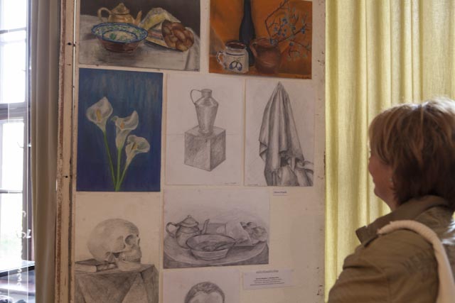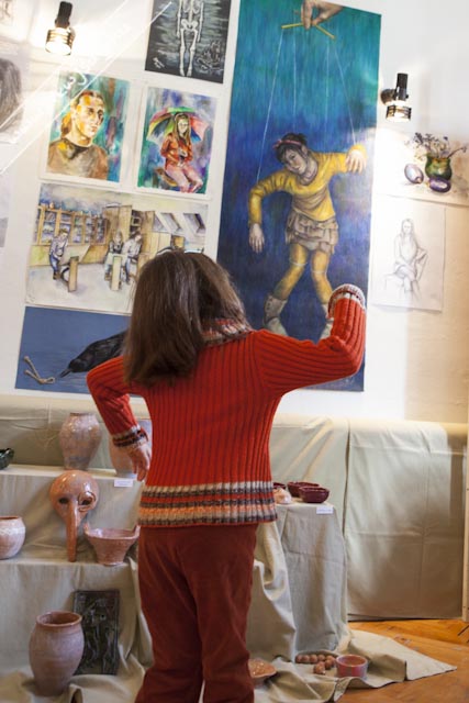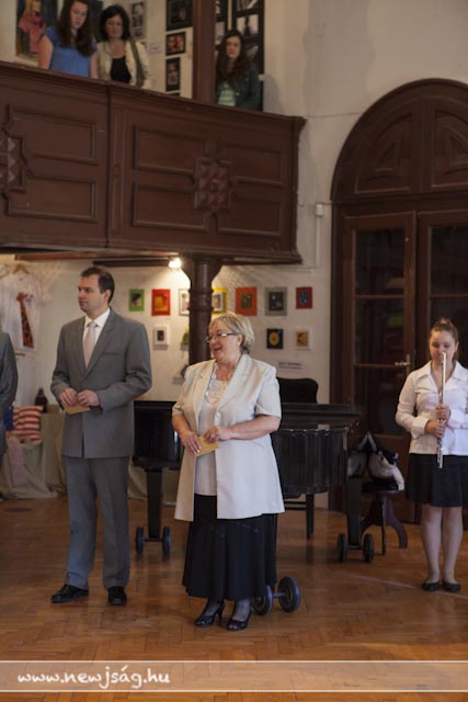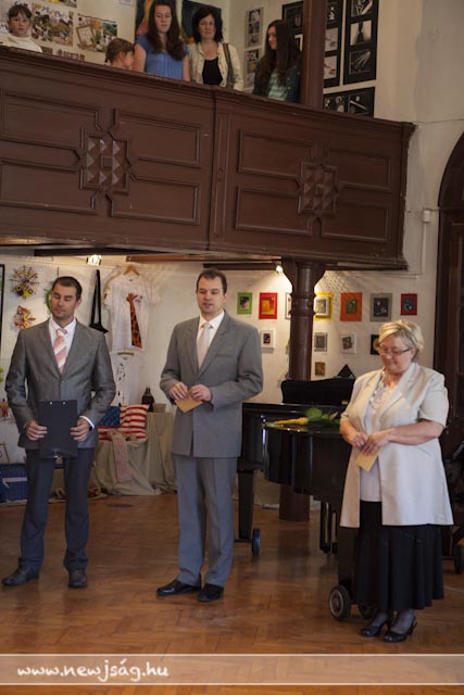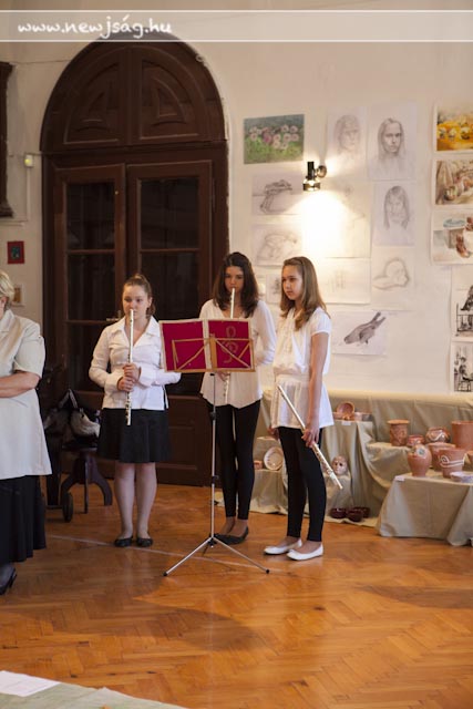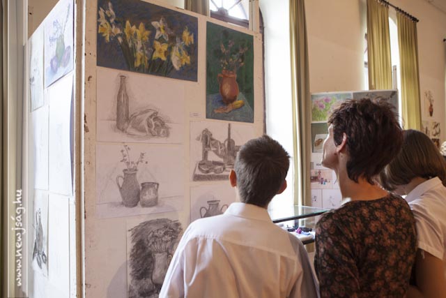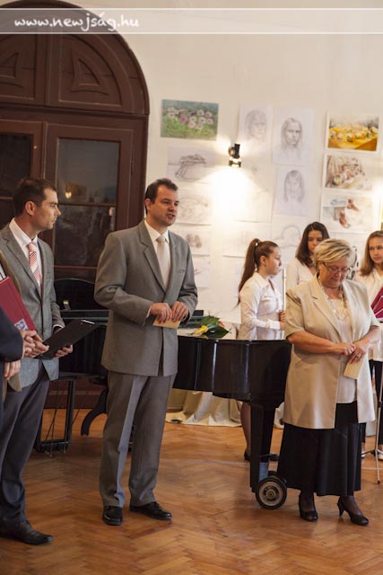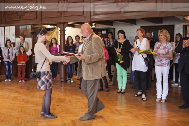 A Chován tudatának másik felét Kepenyes András tankerület-vezető testesítette meg, aki nagyon jól fogalmazta meg, hogy “a művész feladata a szépség megalkotása”, az a kiállítás pedig a profizmus felé vezető út első állomása lehet. Ezt megerősítette Brachna Irén igazgató azzal, hogy elmondta, kik tanulnak tovább szakirányban az idei végzősök közül: Hamza Brigitta és Korbely Flóra a Békéscsabai Evangélikus Gimnázium képzőművészeti tagozatán, Pető Réka a Tömörkény kerámia szakán, Borgula László a Szent-Györgyi Albert Gimnázium képzőmész-grafikai tagozatán fogja a profizmus felé vezető második lépcsőt megtenni, Basilides Kinga pedig a Magyar Képzőművészeti Egyetem felvételijének első fordulóján van túl. A képzőművészek közül ebben az esztendőben ő érte el az iskola legjobb eredményét: a 4. fotó-videó országos tanulmányi versenyen döntőbe jutott. Az idén neki ítélte oda a Ruzicskay György Közalapítvány kuratóriuma a Ruzicskay-díjat is, amit dr. Demeter László adott át a kivételes tehetséggel megáldott ifjú hölgynek. Nem véletlenül, hiszen Kinga fotói mellett festményei is felkerültek a falakra. Bevezető képünknek is egy korai Basilidest választottunk. Fogunk még hallani róla.