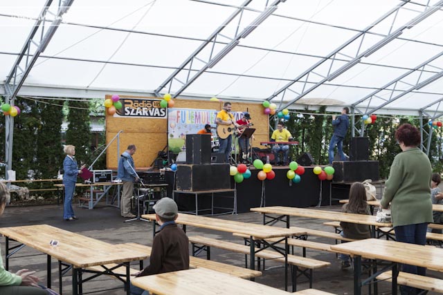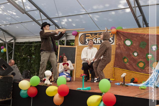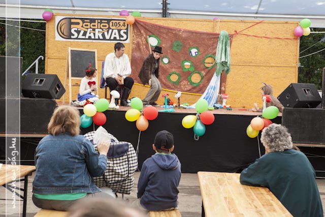 Gyerekzsivajtól volt hangos a Cervinus Teátrum mögötti tér. A bemelegítést a Fülemüle zenekarra bízták a teátrum munkatársai. A kicsik inkább a játszótéri eszközökön végeztek magukat és szüleiket is átmozgató edzést. Szerencsére a hang minden irányba terjed, így a mászókán lógva sem maradtak le semmiről, amiről gondoskodott a hangtechnikát kezelő Csasztvan Béla. Fülemülééket egy érdekes kísérlet követte. Egy családi színház, ahol apa, anya és két gyerek lépett a színpadra és adta elő Nyuszimesék című mesejátékát az egyre gyülekező gyerekseregnek.
