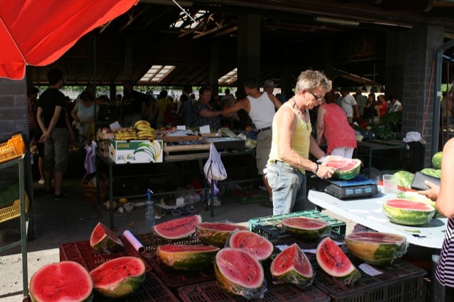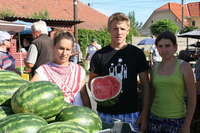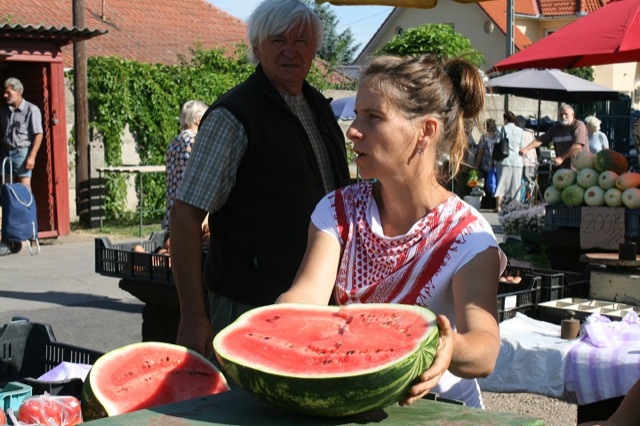 Megjelentek az első dinnyeárusok is a piacon. Kis Pálné, hódmezővásárhelyi kereskedő két gyermekével – Mónikával és Álmossal – együtt kínálta a piros bélű nagykamarási görög- és sárgadinnyéket.