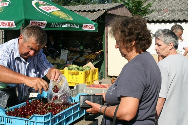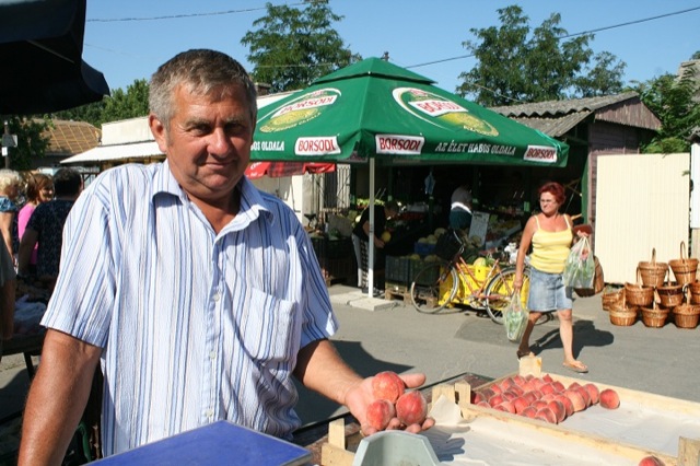 Kovács Lajos, lakitelki őstermelő meggyet és őszibarackot hozott ma a szarvasi piacra: