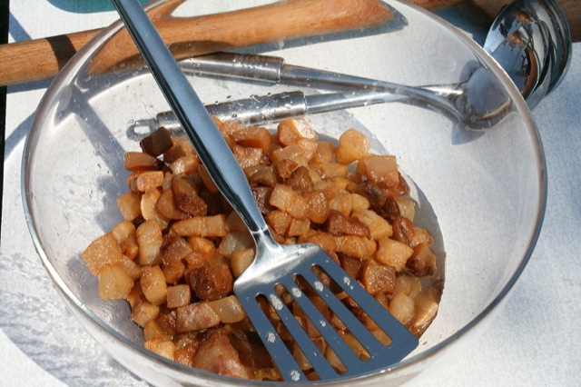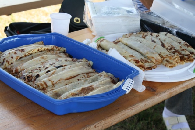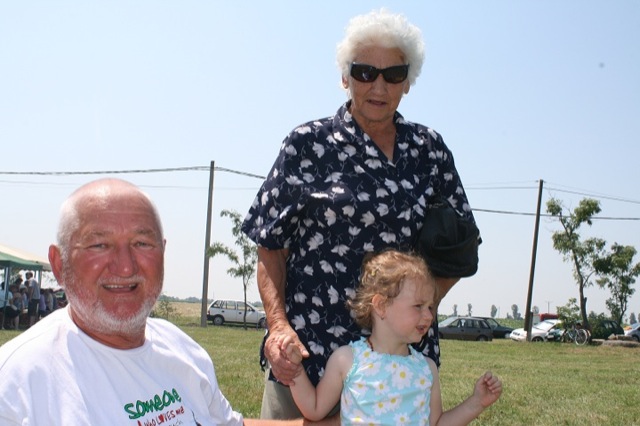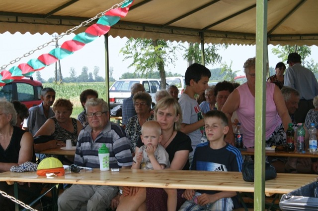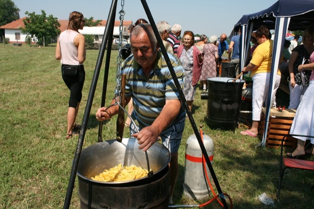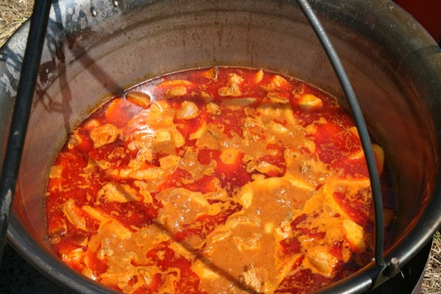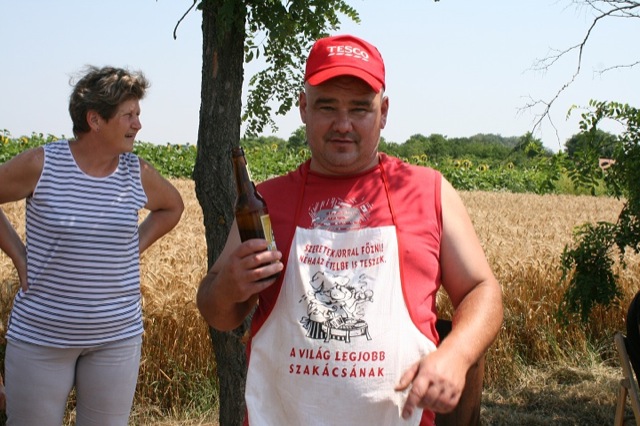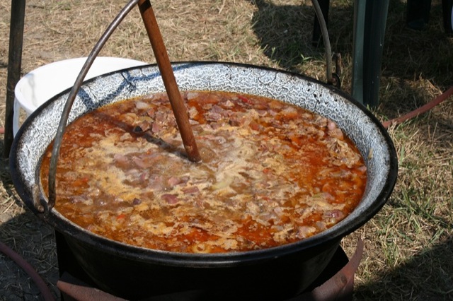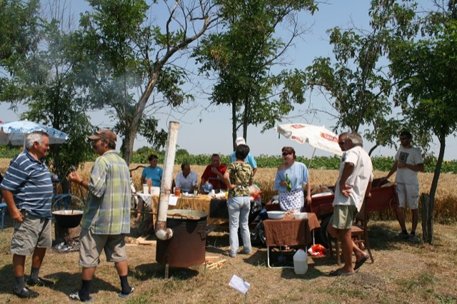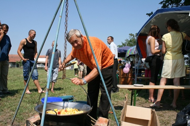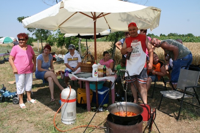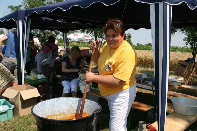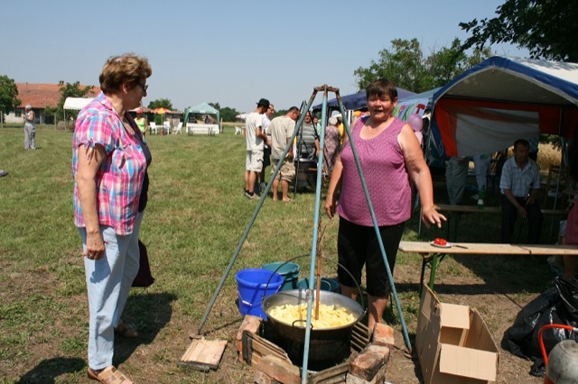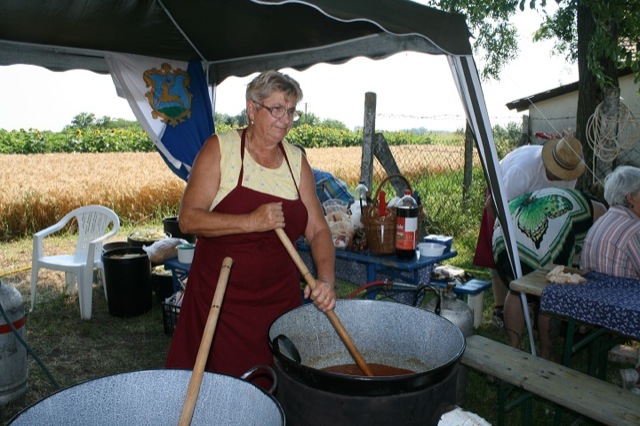 Természetesen közben a bográcsokba is belenéztünk. Elsőként a Középhalmi Csicsergők nevet viselő csapatnál álltunk meg, akikről kiderült, hogy a középhalmi idősek klubjának tagjai. Janecskó Jánosné vezényletével és Krajcsovicz Mihály segédletével egy jó nagy adag krumplipaprikást főztek, természetesen házikolbásszal. Krajcsovicz Mihály azt is elárulta, hogy ő bizony nagyon kedveli az efféle együttléteket, sőt még a farsangi bohóckodásokban is szívesen benne van. Legutóbb például menyasszonynak öltözött be, de volt már kisdobos és úttörő is.