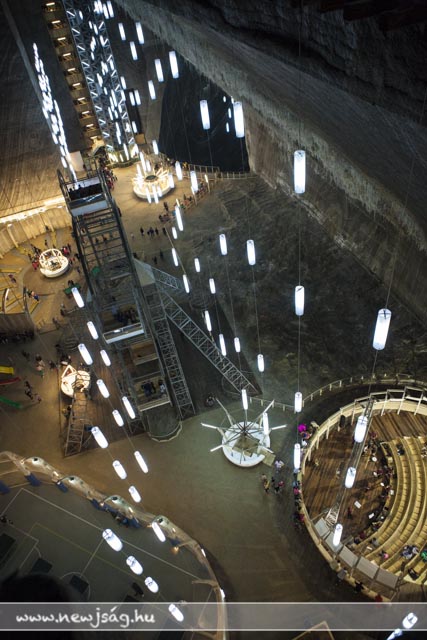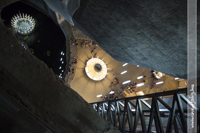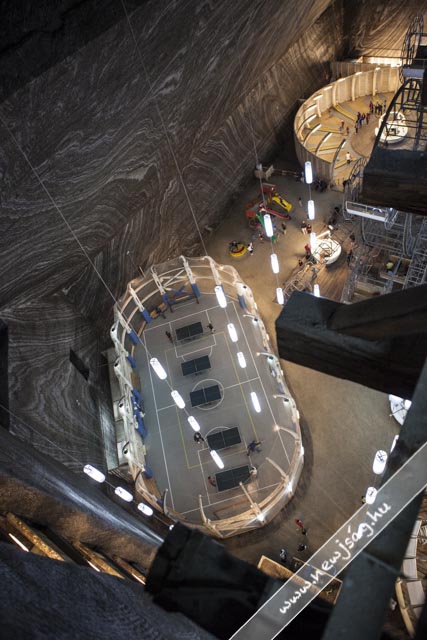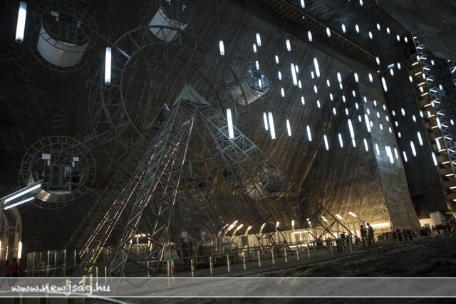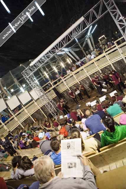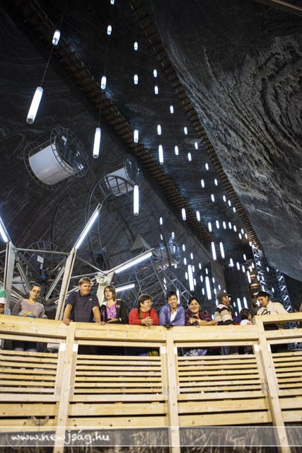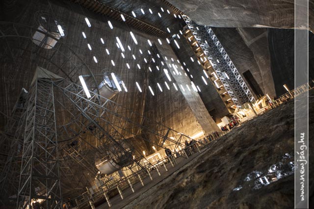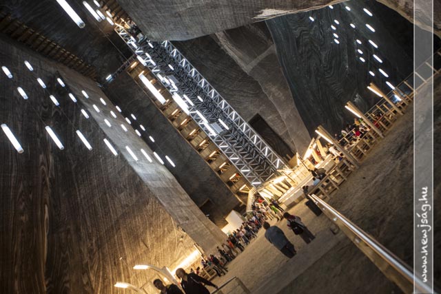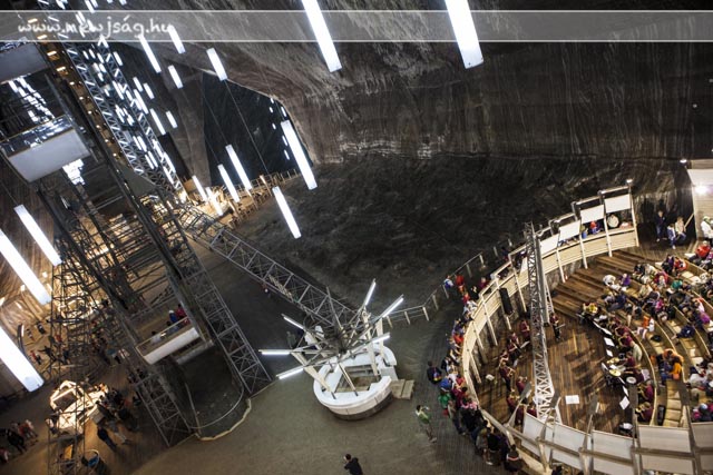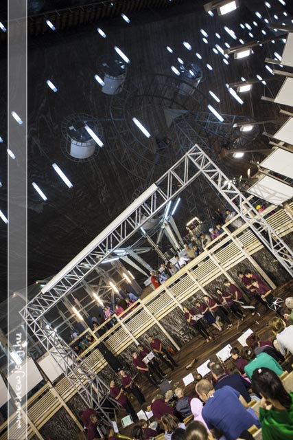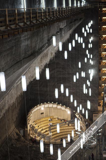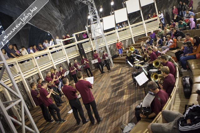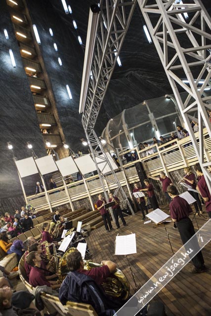 Arra sem legyint az ember, ha azt hallja, hogy sóbányában lépett fel egy zenekar, de a tordai sóbányánál egzotikusabb környezetet ebben a műfajban nehéz találni. Ez a szerencse érte a Szarvasi Hagyományőrző Fúvózenekart szombaton, erdélyi túrájuk egyik fellépésén. Ahogy a mi Víziszínpadunknál kevés színpad van szebb természetes környezetben, addig abban egészen biztos vagyok, hogy a tordainál kevés trendibb. A román építészeten eddig nem sok csodálnivalót találtunk, de ezt a modern ipari, de inkább space-be hajló vonalat nagyon elkapták. Az embernek leesett az álla, már csak a méretek láttán is. Egy 12 emelet magas, hatalmas földalatti termet, aminek sótól csillog a fala, rozsdamentes acél és fa berendezési tárgyakkal töltöttek meg elképesztően jól megkomponáltan. Az embernek az az érzése, hogy egy idegen bolygón egy Alien testében bóklászik, de legalábbis az Alfa holdbázison, és már-már látni véli a Földet ismét megmenteni akaró Bruce Willist egy önjáró fúróval, hóna alatt egy atomtöltettel. Ebben a környezetben el is hinnénk, hogy ez most komoly.