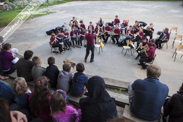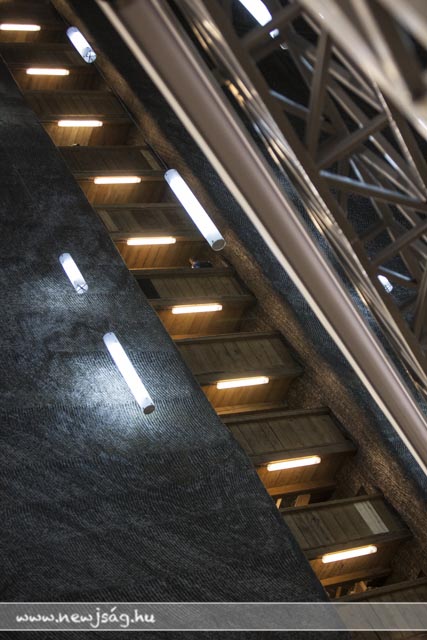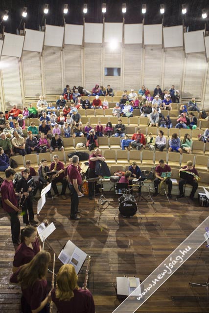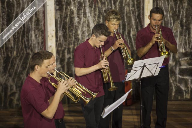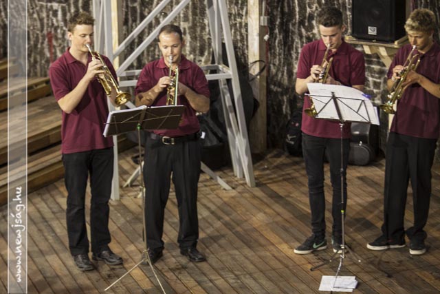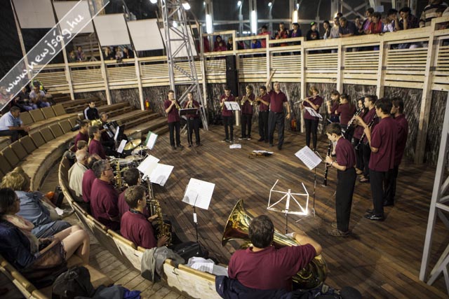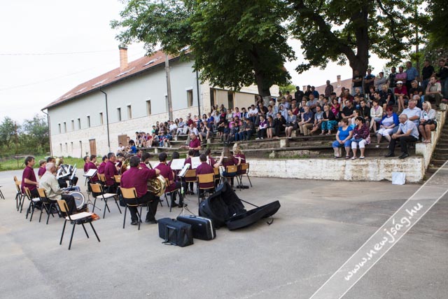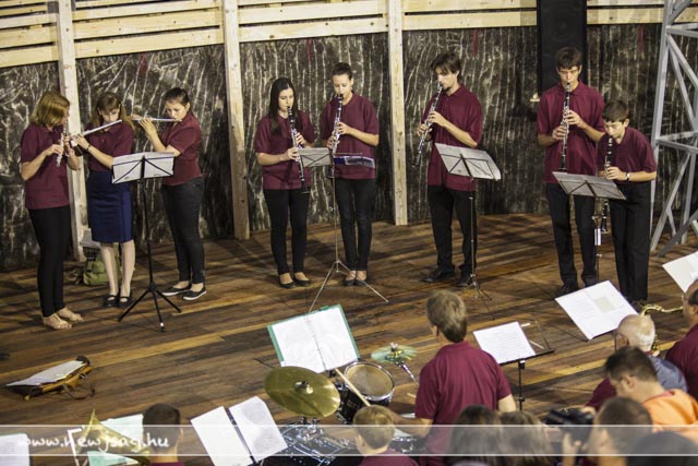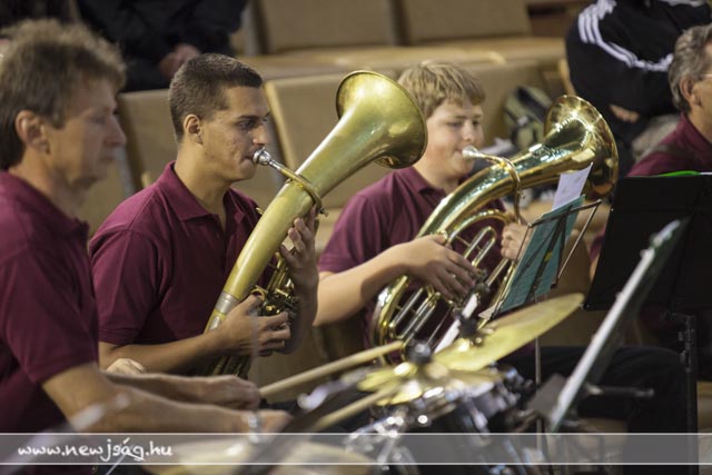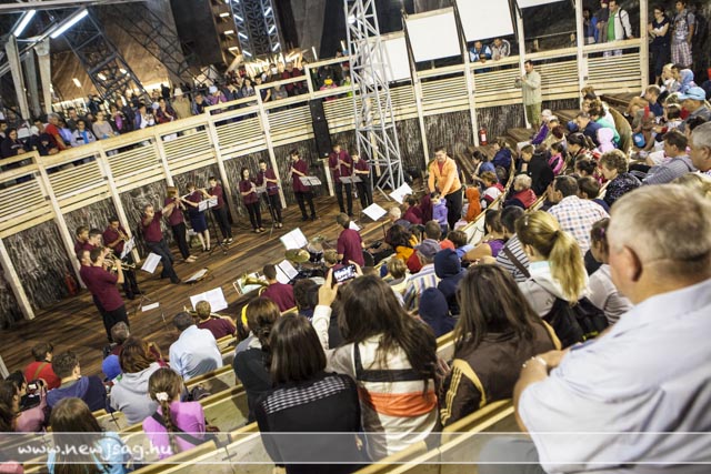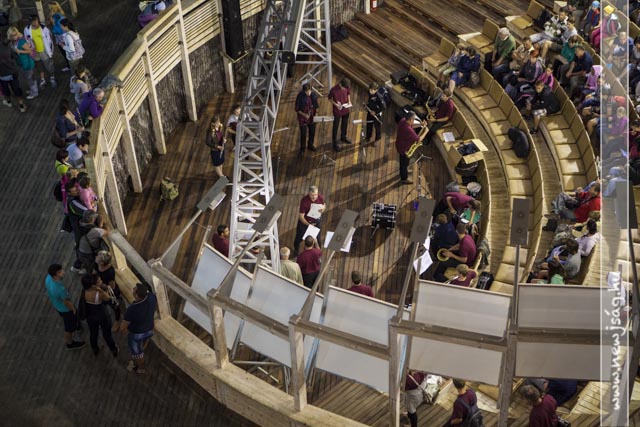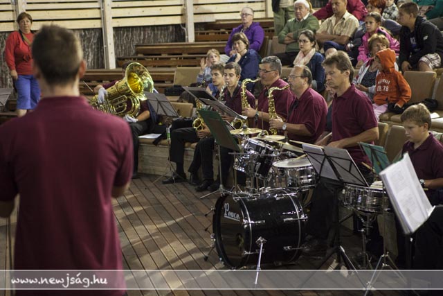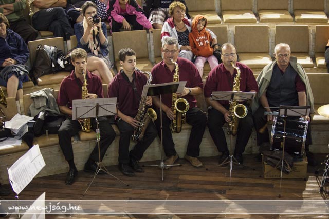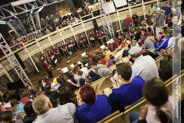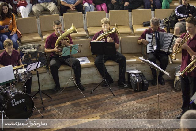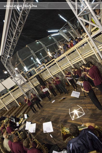 Ne feledkezzünk meg a terem egyik sarkában kialakított zenepavilonról sem. Nem nagy, de az építők nagyon komolyan gondolták a minőséget. Minden fa és fém. Véletlenül az is van a környéken, így tényleg nem kellett megalkudniuk semmivel. Ezen a színpadin lépett fel fúvószenekarunk egy elég bátran összeállított zenei programmal. Ez három részből állt. Az első és a harmadik harmad magyar történelmi indulókból, a közepe pedig populárisabb darabokból állt. A közönség folyamatosan cserélődött. A látogatók leültek meghallgatni egy-egy zeneszámot, majd tovasétáltak, hogy andalgás közben élvezzék tovább a zenét, ill. hogy újaknak adják át a helyüket. Minden számot vastaps kísért.