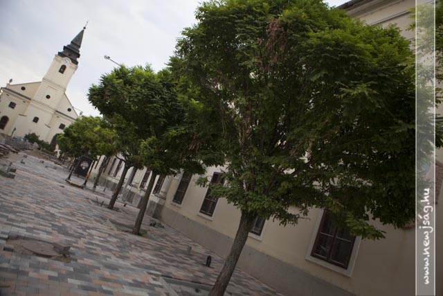 A Tessedik Sámuel Múzeum előtti Vajda szakasz múzeum felőli oldala ilyen. Itt már elkezdődött a térkövezés és az alapbeton tegnap estére már az Ótemplomig ért. Egyelőre szokatlan a teret ilyennek látni. Szokatlan a kövezése, de ha kész lesz, biztosan mást fog mutatni.