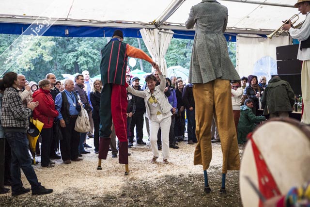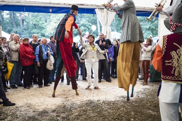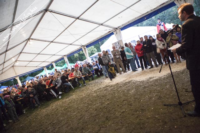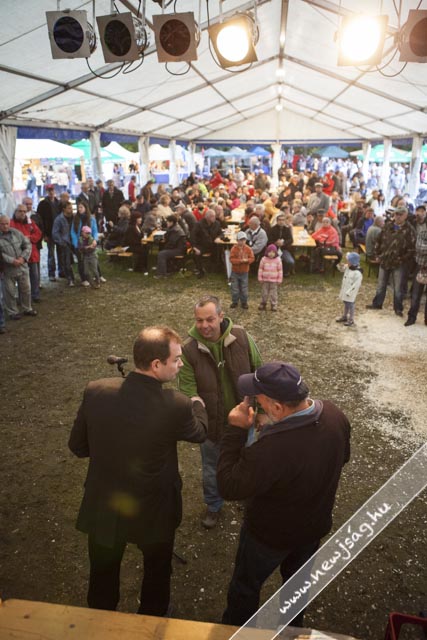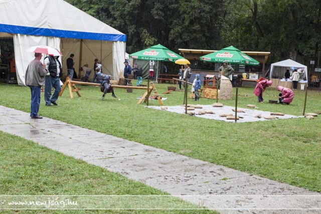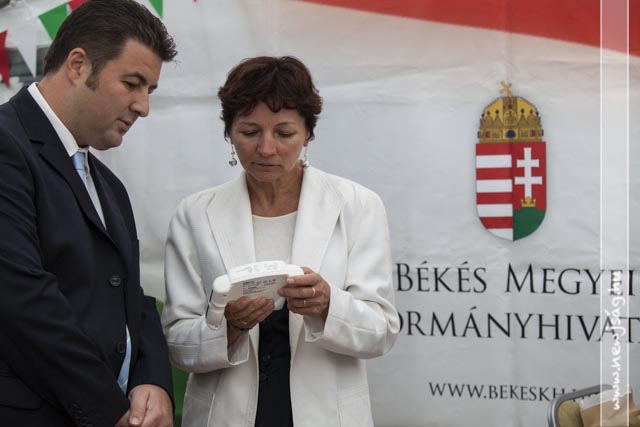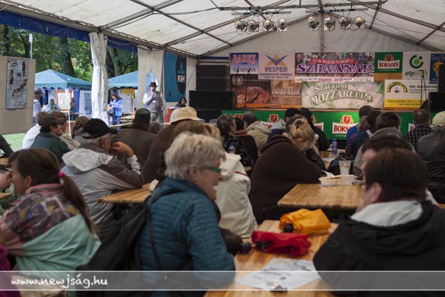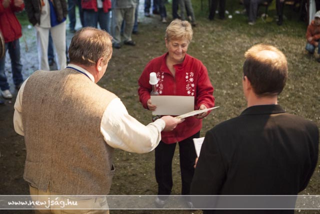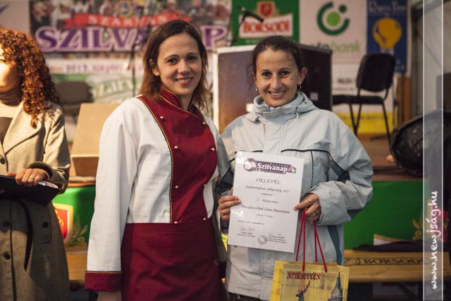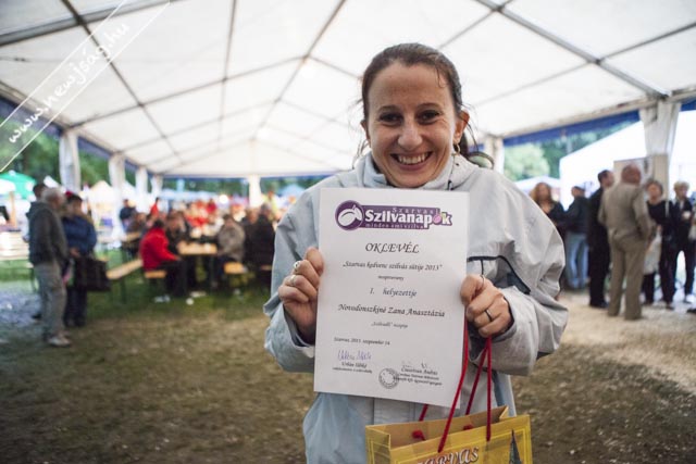 Az eső meg csak esett. És esett. Az ember azt gondolná, hogy az ilyen időjárás agyoncsap egy ilyen mulatságot, de nem. Az eberek folyamatosan jöttek. Délelőtt főleg a kisgyermekesek, akiket a gyereksátorban Novodomszky Éva fogadott. Délután az idősebbek is megérkeztek, akiknek a Kolompos zenekar, majd a Tessedik Táncegyüttes kedveskedett programmal, miközben megnyitottak egy-két kiállítást itt is, ott is. A pálinkaminősítés eredményhirdetése előtt egy drámai bejelentésre is sor került, de erről majd inkább az arról szóló írásunkban ejtünk szót. Kiderült, ki “Szarvas kedvenc szilvás sütijének az elkészítője”. Ő Novodonszkiné Zana Anasztázia és a “szilvadli” receptjével nyert. Neki Urbán Ildikó cukrászmester adta át az elismerő oklevelet.