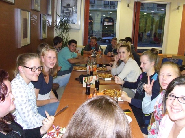 Vasárnap este még sort kerítettünk egy közös pizzázásra. Itt már nagyon felszabadult és vidám hangulat uralkodott, még a másnapi búcsúzkodás sem érződött, csak mikor a vacsora végén a finn diákok és tanárok egy dalt énekeltek nekünk.