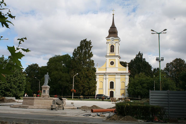 Felvételünkön a katolikus templom és a Fő téri szökőkút látható. Mindkettő díszkivilágítást kap majd.