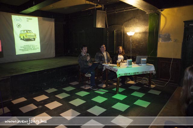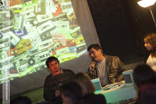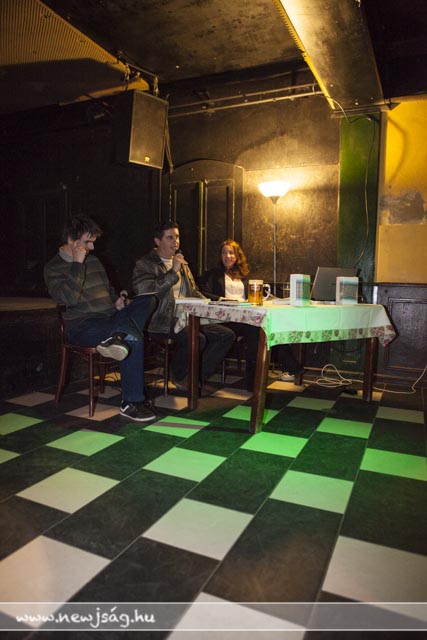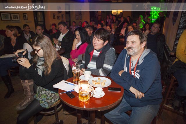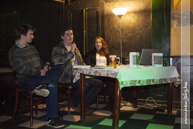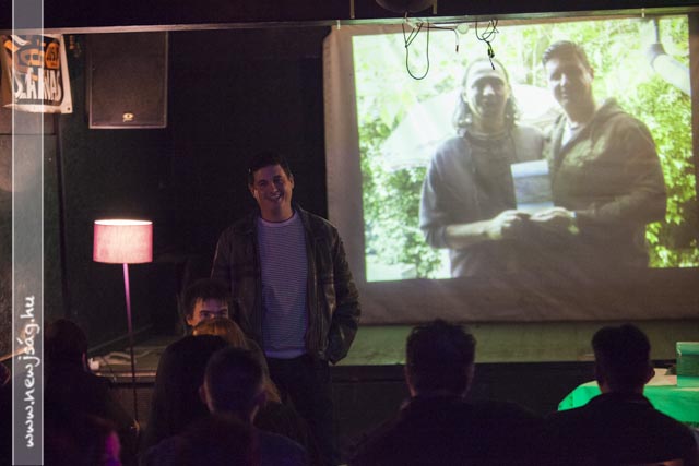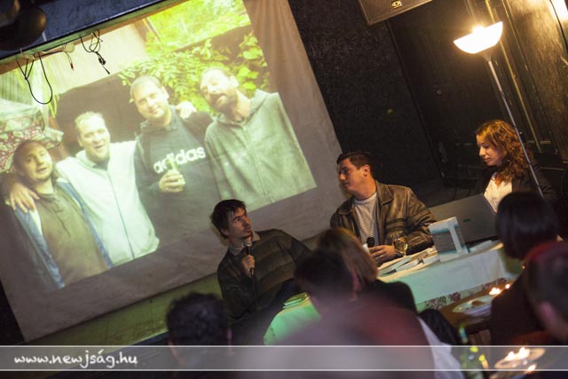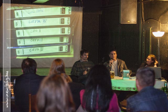Ezután elhangzott az első kérdés, amire a szerző a következő, fel nem tett kérdésekre is megadta a választ. A beszélgetők mögött képek futottak a vetítővásznon: régi sztárok, meg egyebek. Egy-egy kép zajos sikert aratott, nem kis zavart idézve a beszélgetés fonalában: ezeken a képeken a közönség kötetben szereplő tagjai láthatták magukat – anno. Remekül szórakoztak.