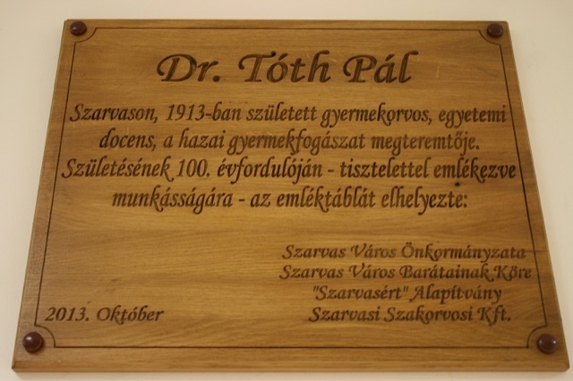 Száz esztendővel ezelőtt, Szarvason született a magyarországi gyermekfogászat megteremtője, dr. Tóth Pál. Az ő tiszteletére avattak emléktáblát szerdán a Szarvasi Szakorvosi Kft. Szabadság utcai rendelőjének aulájában. Az emléktáblát az önkormányzat, Szarvas Város Barátainak Köre, a Szarvasért Alapítvány és a Szarvasi Szakorvosi Kft. közösen állította.