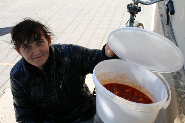 Nemes Ildikó egy fehér műanyag vödörrel érkezett, jó pár adag ételt vitt haza.