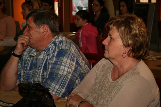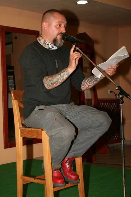 Benkő Gézát a szarvasi közönség már jól ismerheti, a Cervinus Teátrum oszlopos tagjaként ugyanis számtalan darabban nyújtott kiváló alakítást. Most azonban írói vénáját is megmutatta. Keserédes iróniával tárta elénk korunk visszásságait. A virtuális kutyáját sétáltató, számítógépétől elszakadni képtelen ember agyának zakatolását úgy írta le, hogy azon egyszerre sírhatott és nevethetett a közönség. Madár Veronika kiváló előadótársnak bizonyult, mind prózában, mind dalban.