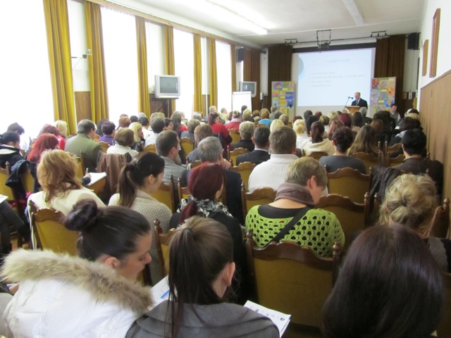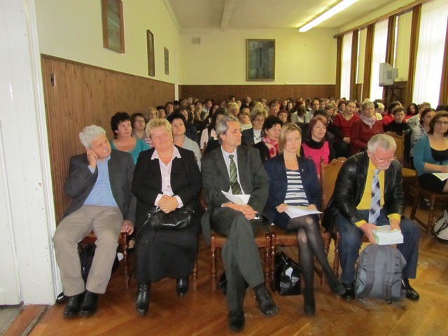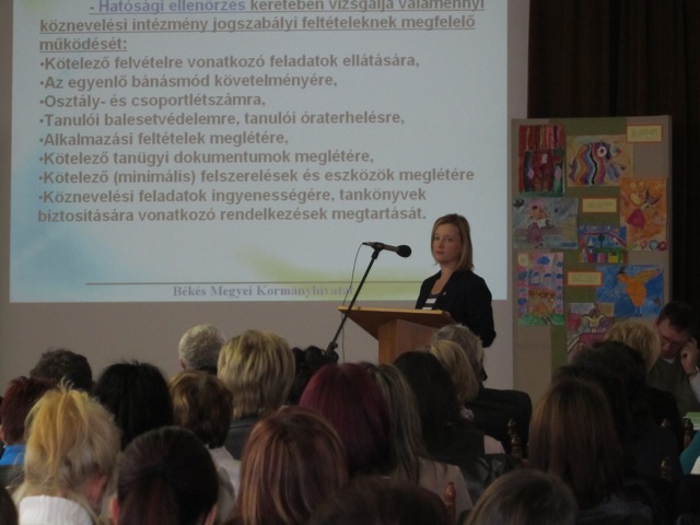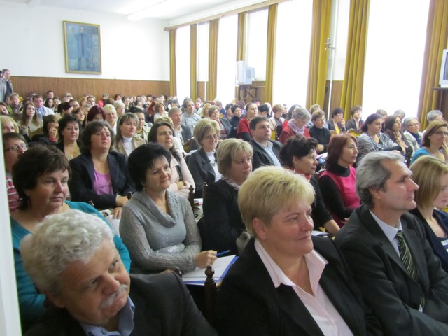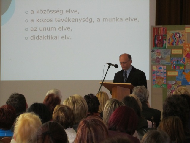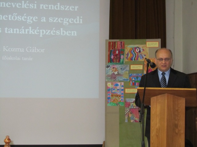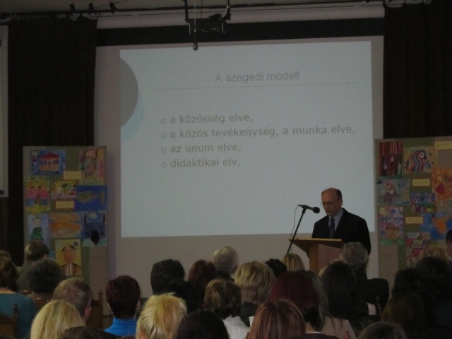 Dr. Lipcsei Imre dékán, főiskolai tanár Békés megye megjelent pedagógusait utoljára köszöntötte, mint a SZIE ABPK vezetője, és köszöntőjében megfogalmazta, hogy a 2014. január 1-től a Szeged-Csanádi Egyházmegye fenntartásában működő Gál Ferenc Főiskola karaként, változatlanul kiemelten fontosnak tartja, hogy hatékony párbeszéd legyen a gyakorlat és a tudományos munka között. A jó köznevelés, jó pedagógusképzésen nyugszik, és a folyamatos képzés, önképzés, ami erősebbé teheti a pedagógus pálya szakmai tartását. A dékáni köszöntőt követően Dr. Kozma Gábor rektor, főiskolai tanár köszöntötte a konferencia több mint százötven fős közönségét, és mint házigazda, örömét fejezte ki, hogy a szarvasi pedagógusképző hagyományok gazdagodnak, hiszen szeptember óta a Gál Ferenc Főiskolának intézménye van Szarvason, és januártól a szarvasi óvó- és tanítóképzés is a keresztényi pedagógia szellemében folytathatja munkáját, a régió főiskolájává váló Gál Ferenc Főiskola szervezeti keretein belül. Nyitóelőadásban egy valódi innovációs modellt ismerhetett meg a hallgatóság, Egy képzési-nevelési rendszermodell lehetősége a szegedi katolikus tanárképzésben című előadásban. Az előadás kiemelte a keresztényi pedagógiai vonatkozásait, érzékeltetve a felsőoktatás érzékenységét a köznevelésben zajló folyamatok iránt. Az előadás nagyívűségét a moderátor a Kisherceg szerzőjének egy gondolatával összegezte, mely azt fogalmazza meg, „ha hajót akarsz építeni, akkor ne azzal kezd, hogy munkásokat toborzol és fát gyűjttetsz velük, szerszámokat adsz nekik és kiosztod a feladatokat, hanem keltsd fel bennük az olthatatlan vágyat, a végtelen tenger iránt.” A következő plenáris előadást Dr. Hegedűs Gábor ny.főiskolai tanár a Projektpedagógiai Társaság elnöke tartotta, A projektpedagógia a gyakorlatban címmel. A nyitóelőadás és a plenáris előadás elemeiben, amely a projektpedagógiai metodikáját illeti, több „összekacsintás” volt fellelhető, amelyek egymást erősítették, és jó hangulatú szakmai megalapozói voltak a későbbi szekciómunkáknak. Hrabovszki Mihály a Békés Megyei Pedagógiai Intézet mb. igazgatója, aki házigazdaként is köszöntötte Békés megye óvodapedagógusait, tanítóit, tanárait, intézményvezetőit, előadásában bemutatta a szaktanácsadói és tantárgygondozói rendszer kiépítését, kiépülését Békés megyében. Az előadás magyarázta, és rendszer szinten mutatta be a szaktanácsadói struktúra működését, kiépülését, és aktuális adatokkal, információkkal szolgált Békés megyét illetően. Dr. Malatyinszki Anita a Békés Megyei Kormányhivatal Oktatási Főosztályának főosztályvezető-helyettese, az intézmények működésének ellenőrzési gyakorlatát mutatta be. Előadása az „Ellenőrzés szó” finomítását is elvégezte, hiszen a folyamatos segítség lehetőségét és a pártoló odafigyelést erősítette a hallgatóságban. Takács Péterné, az Apáczai Kiadó értékesítési- és marketing igazgatója, a készülődő tankönyvi újításokat vette lajtsromba, és mint a konferencia egyik fő támogatója, ajánlotta a hallgatóság figyelmébe tankönyvkínálatukat. A konferencia hat szekcióban folytatta munkáját. Az óvodapedagógusok szekciójában projekttervezés az óvodában témakörben Faggyas Jánosné és Fabóné Nagy Andrea szakvezető óvodapedagógusok irányításával folyt a munka. Az erkölcstan, mint „új„ tantárgy bevezetésének tapasztalataival, gyakorlati módszertani kérdéseivel foglalkoztak az erkölcstant tanító tanítók és tanárok, Bíró Gyula igazgató, szaktanácsadó, vezető tanár irányításával. Pomázi Imréné igazgató-szaktanácsadó, a jászberényi SZIE Gyakorló Általános Iskola és Gimnázium vezetője iskolaigazgatóknak és óvodavezetőknek mutatta be a pedagógusok értékelésének, és minősítésének gyakorlatát, a pedagógus életpálya rendszerében elhelyezve, a pilot programok eddigi eredményeinek tükrében. A negyedik szekcióban bemutató tanításon vehettek részt a pedagógusok, a GFF Gyakorlóintézményének harmadik osztályában, Lestyán Erzsébet főiskolai tanársegéd irányításával, ahol a differenciált tanulásszervezés finomságait élőben is láthatták, tapasztalhatták, és elemezhették a résztvevők. A matematikát tanító tanítók és tanárok szekciójában Dr. Hegedűs Gábor a diszkalkulia és a matematika tanítás „viszonyát” és helyzetét mutatta be, megoldási javaslatokat láttatva a témával kapcsolatban. A pedagógiai szakszolgálat működése, feladata témában Csepregi András a Békés Megyei Pedagógiai Szakszolgálat mb. főigazgatójának témavezetésével szerveződött a konferencia hatodik szekciója, ahol gyógypedagógusok és fejlesztőpedagógusok cserélhettek eszmét, juthattak információhoz. A rendezvény ideje alatt az Apáczai Kiadó tankönyvreferense mutatta be és nyújtott információt a forgalomban lévő és folyamatosan készülő tankönyvi kínálatról. A konferencia másik fő támogatója a Korona Étterem látta vendégül a konferencia résztvevőit.