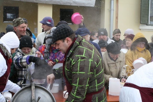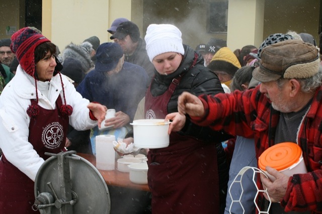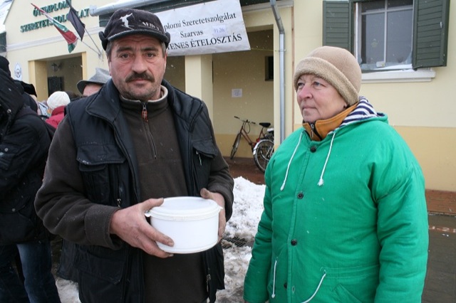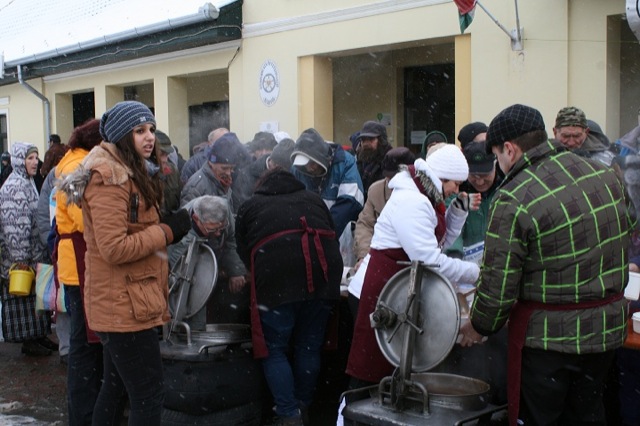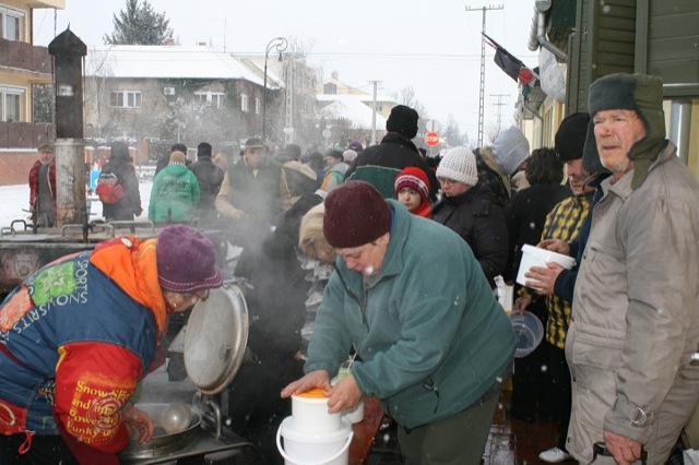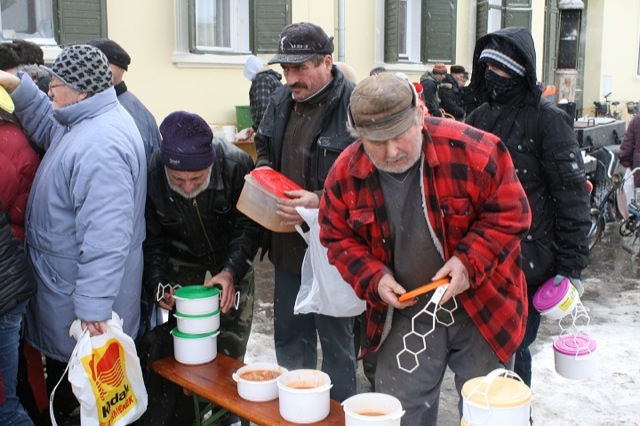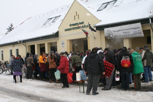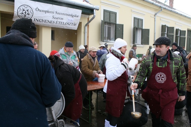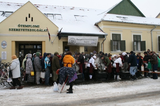 Vasárnap a csípős téli hidegben és hóesésben a szokásosnál is jóval többen sorakoztak ételhordóikkal az Ótemplomi Szeretetszolgálat épülete előtti ingyenes ételosztáson. A menü ezúttal székelykáposzta volt. Mire fél tizenkettőt ütött az óra, már annyian álltak az asztalok előtt, hogy többen azon töprengtek, vajon jut-e mindenkinek az ebédből.