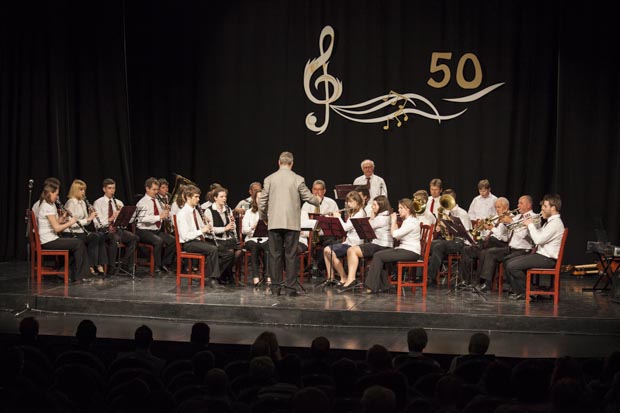 Az emlékezés sorában a látvány után a hang következett. Öt órától a zenei szakok mutatkoztak be. A színpadon a korábbi és a jelenlegi zenészek közösen léptek a deszkákra. Fellépett a fúvószenekar, a harmonikaegyüttes és a Városi Kamarazenekar is, de volt, aki csak egy szál magában, kíséret mellett állt a nagyérdemű elé. Olykor-olykor történtek tévesztések is, de az értő közönség a vastapsok legnagyobbikával jutalmazta az egyik ilyen zavar után profin javító fiatal zenészt. A műsort a Chován Kálmán Művészeti Alapiskola néptánc szakos növendékei, a Sköcök zárták.